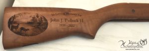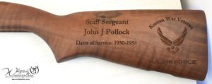 Cody recently requested a custom engraving on his gun stock. Here’s what Cody had to say about his recent order, “I was looking for a way to have a memory of my late grandfather who passed away earlier this year who fought for our country in Korea. At the burial ceremony the gun salute team were using Springfield 1903 rifles. I purchased one of these at a local gun store and bought a new stock for it. I sent the stock to Whitetail woodcrafters after coming up with a design on their website that included the air force logo, his dates of service as well as a cabin with deer picture on the reverse side. The site was very easy to use and they had great ideas of options to put on the stock. I picked what I thought was best and added in a few other requests. They sent me a design proof that looked even better than I could have thought it up. The stock came a few weeks later and looked better than I expected. The engraving was deep, and had a very high level of detail. This is a wonderful memory I have now, that I plan to take deer hunting with me this year so my grandpa can still be out hunting with me.”