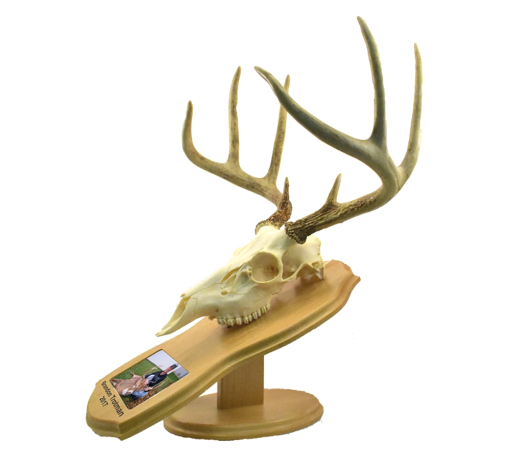 Note: Our European mount plaques come as a 3 piece set with a wooden base, stem, and plaque. These pieces easily assemble with the provided screws and the mounting plaque can be oriented to either hang on the wall or sit on a table top. There is a heavy duty metal hanger on the back and also rubber feet for easy installation. If you choose to order barnwood, please note that because we use authentic reclaimed barnwood, every plaque will vary slightly in coloration, characteristics, and dimensions. Skull is not included.