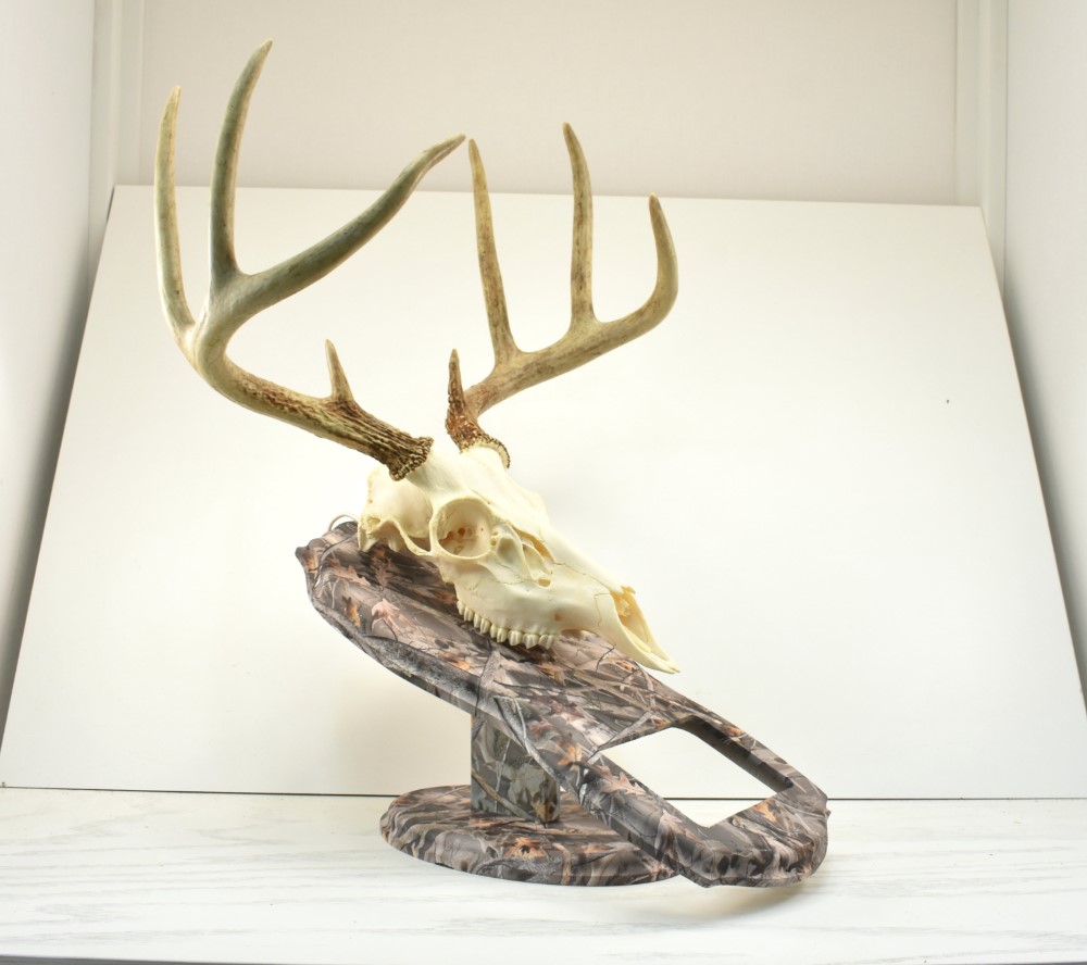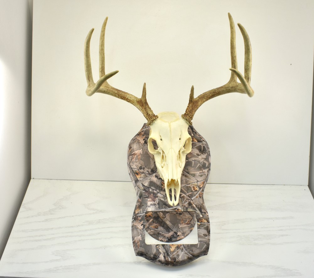 Create a treasured memento from your European mount with a camo photo insert European mount plaque from Whitetail Woodcrafters. This taxidermy plaque is handcrafted in our shop and hydro dipped with a detailed camo pattern that will last forever. Just add a 4×6 photo to make your deer mount plaque into a treasured memento.