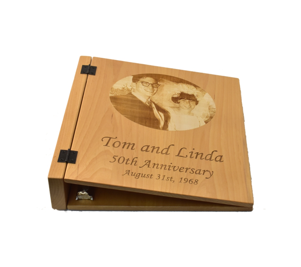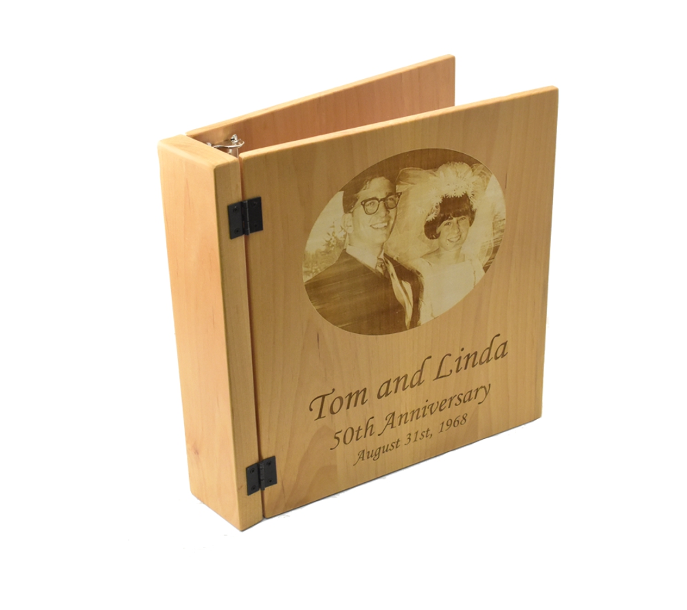 Give a beautiful personalized anniversary gift with an engraved photo album from Whitetail Woodcrafters. All of our 3 ring wood photo albums are handcrafted from solid alder wood and feature a standard 3 ring binder insert that can hold any 8.5” x 11″ page. This allows you to make a completely custom photo album, scrapbook, or guest book. We have a variety of sizes of page inserts available for purchase with your album as well.