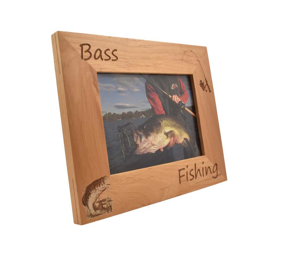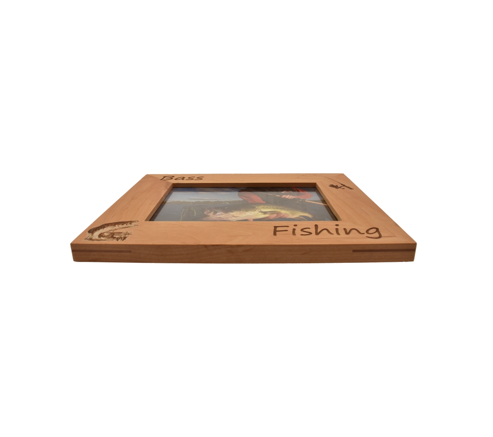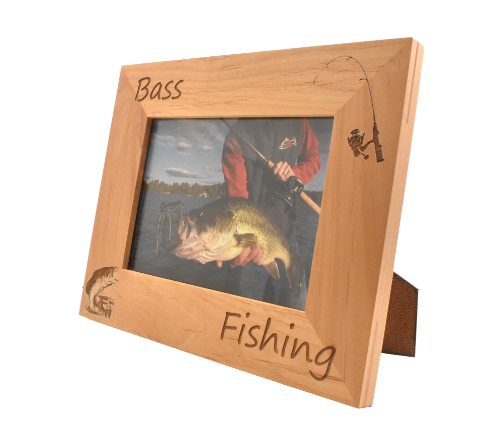 Display all of your favorite bass fishing memories with a personalized fishing picture frame from Whitetail Woodcrafters. This laser engraved picture frame is made from solid alder wood and will look great in your home, office, cabin, or display room. This engraved wooden picture frame is available to hold a 4×6, 5×7, or 8×10 inch photo and can be hung on the wall or set on a flat surface using the attached stand.