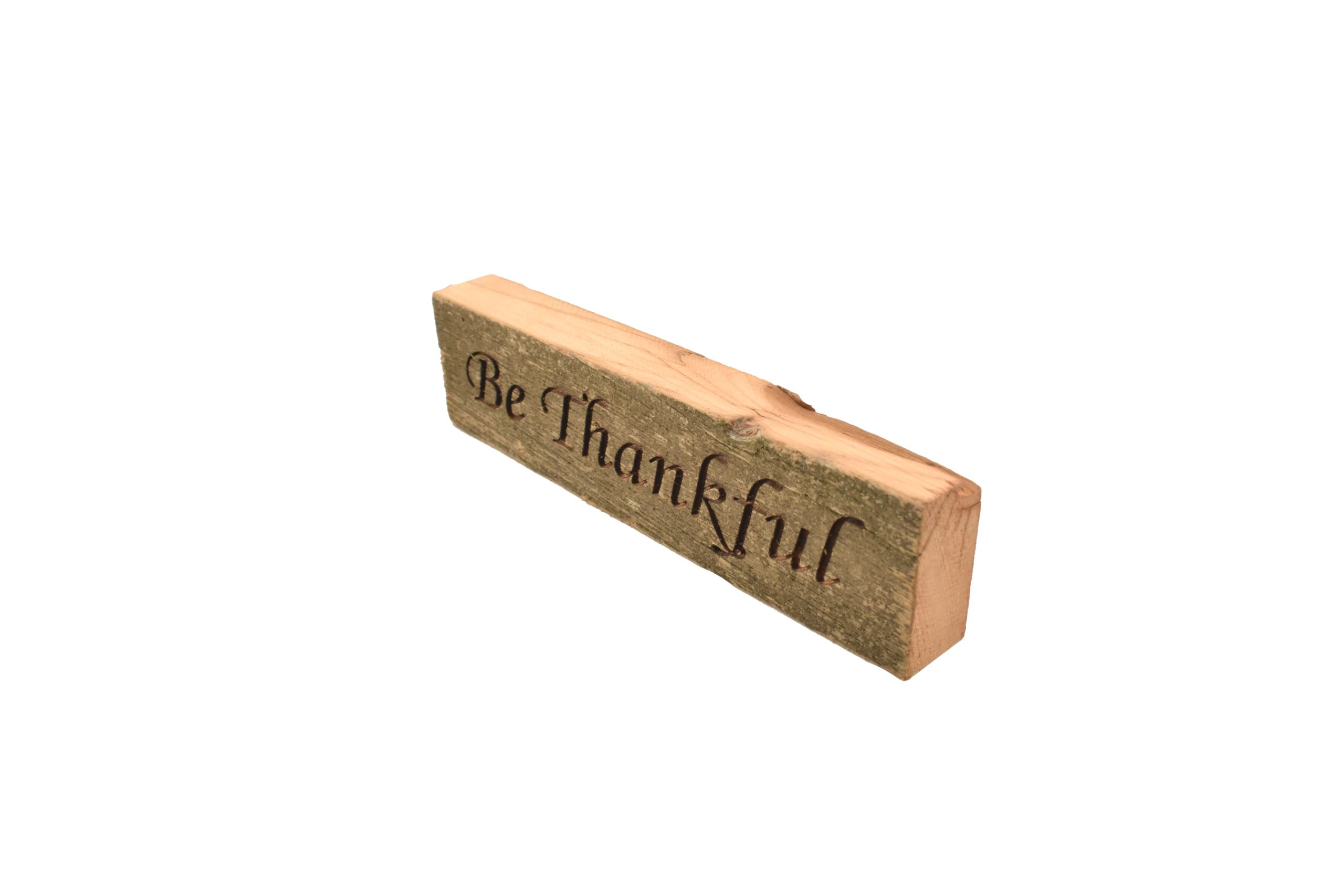 Our wood block signs are made from reclaimed wood from an over 100 year old barn and will look great in any home or cabin. Our “Be Thankful” laser engraved wood block is a good reminder to count your blessings and remember everything that you have to be thankful for.