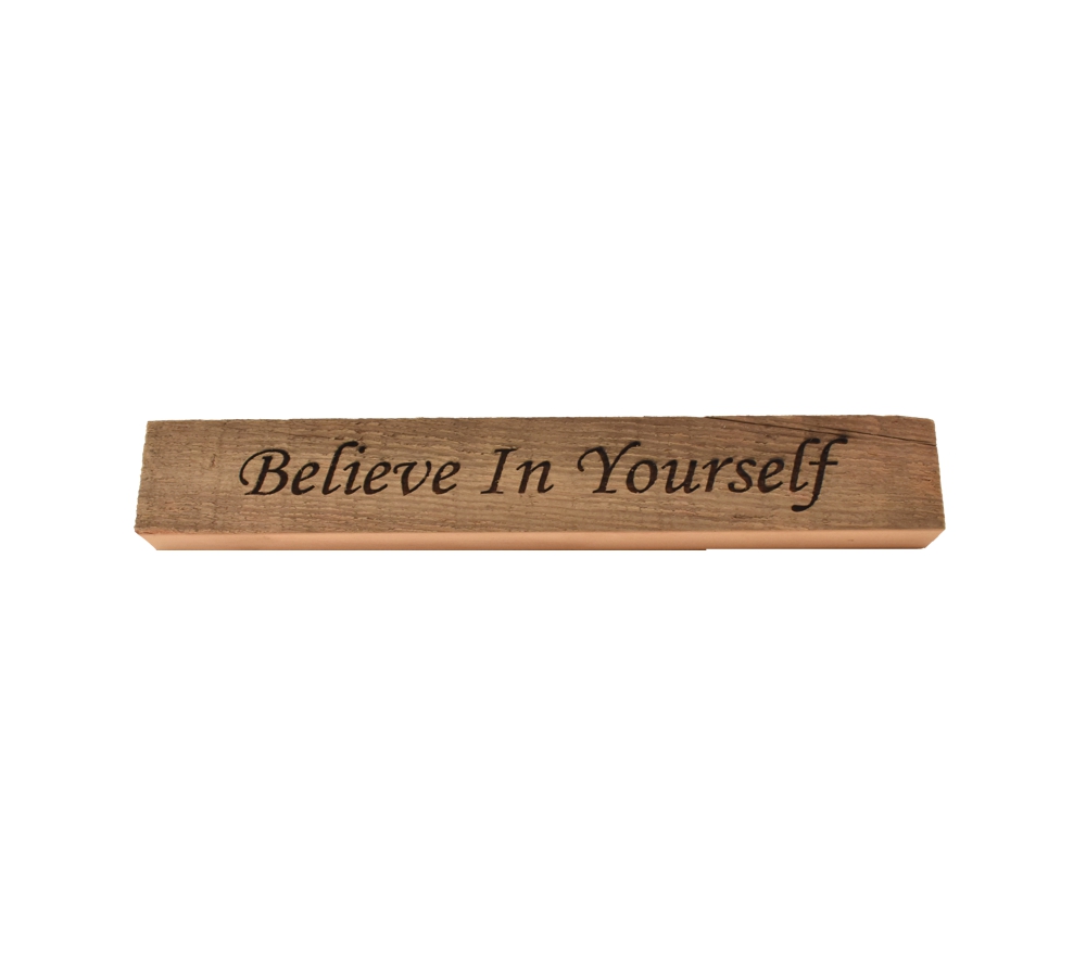 Our wood block signs are made from reclaimed wood from an over 100 year old barn and will look great in any home or cabin. Our “Believe in Yourself” laser engraved wood block will remind you to have confidence in your strengths and abilities.