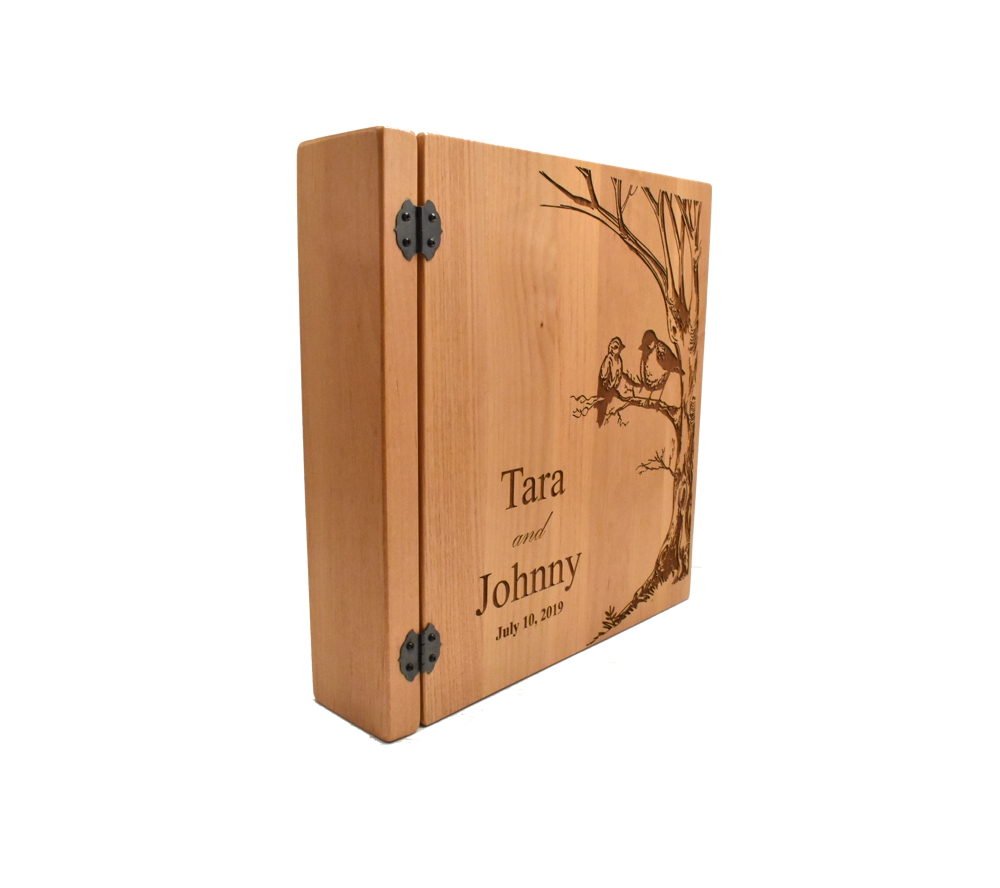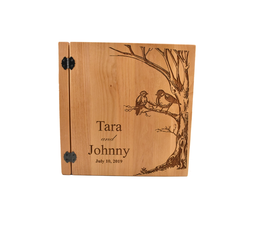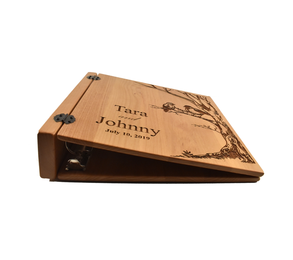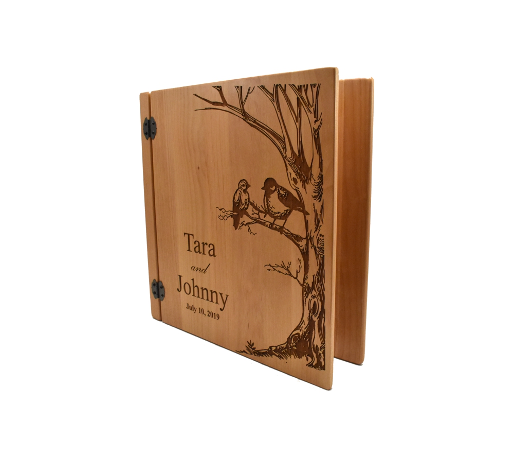 This personalized photo album with our Birds in Tree design is perfect to complement any rustic wedding. Crafted of solid alder, our wedding photo albums will serve as a keepsake of your most special memories. All of our custom engraved wooden photo albums feature a standard 3 ring binder insert that can hold any 8.5″ x 11″ page. This allows you to make a custom album, scrapbook, guestbook, or a mixture of these pages for a completely unique display. We have a variety of sizes of page inserts available for purchase with your album as well.