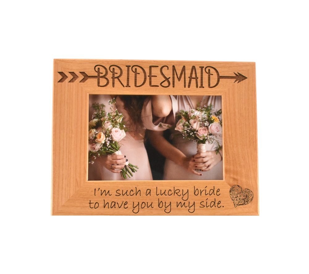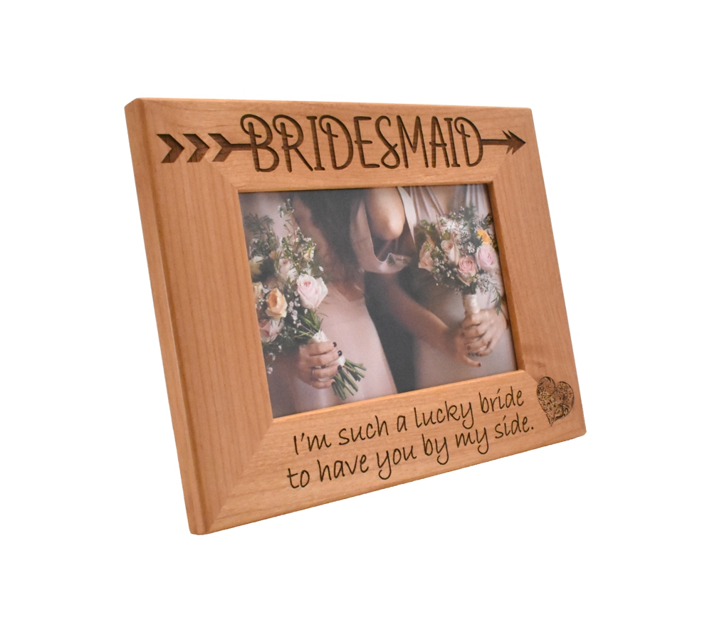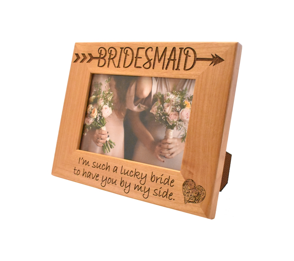 Show your best friends how grateful you are for their support on your big day with a custom bridesmaid gift from Whitetail Woodcrafters. Our solid wood personalized picture frames are handcrafted from premium alder wood and are built to last forever. This engraved picture frame is available to hold a 4×6, 5×7, or 8×10 inch photo and can be hung on the wall or set on a flat surface using the attached stand.