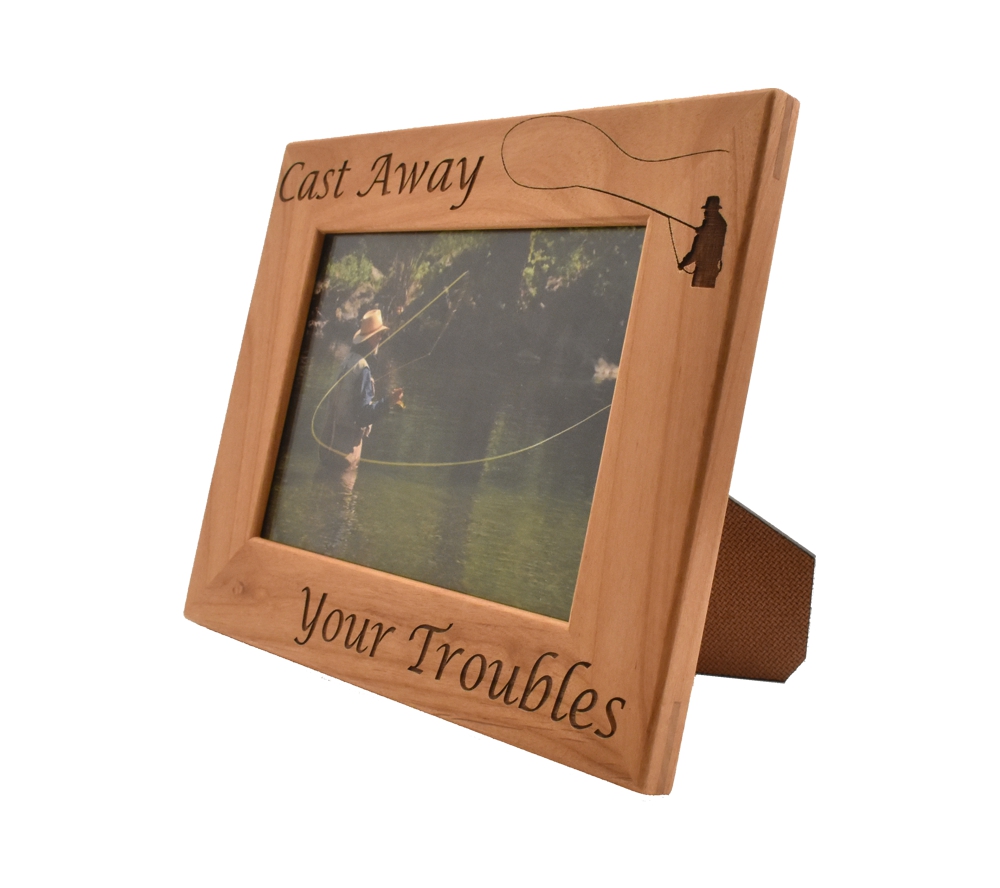 Display all of your favorite fishing memories with a personalized fishing picture frame from Whitetail Woodcrafters. This laser engraved wood frame is made from solid alder wood and will look great in your home, office, cabin, or display room. Our engraved wooden picture frames are available to hold a 4×6, 5×7, or 8×10 inch photo and can be hung on the wall or set on a flat surface using the attached stand.