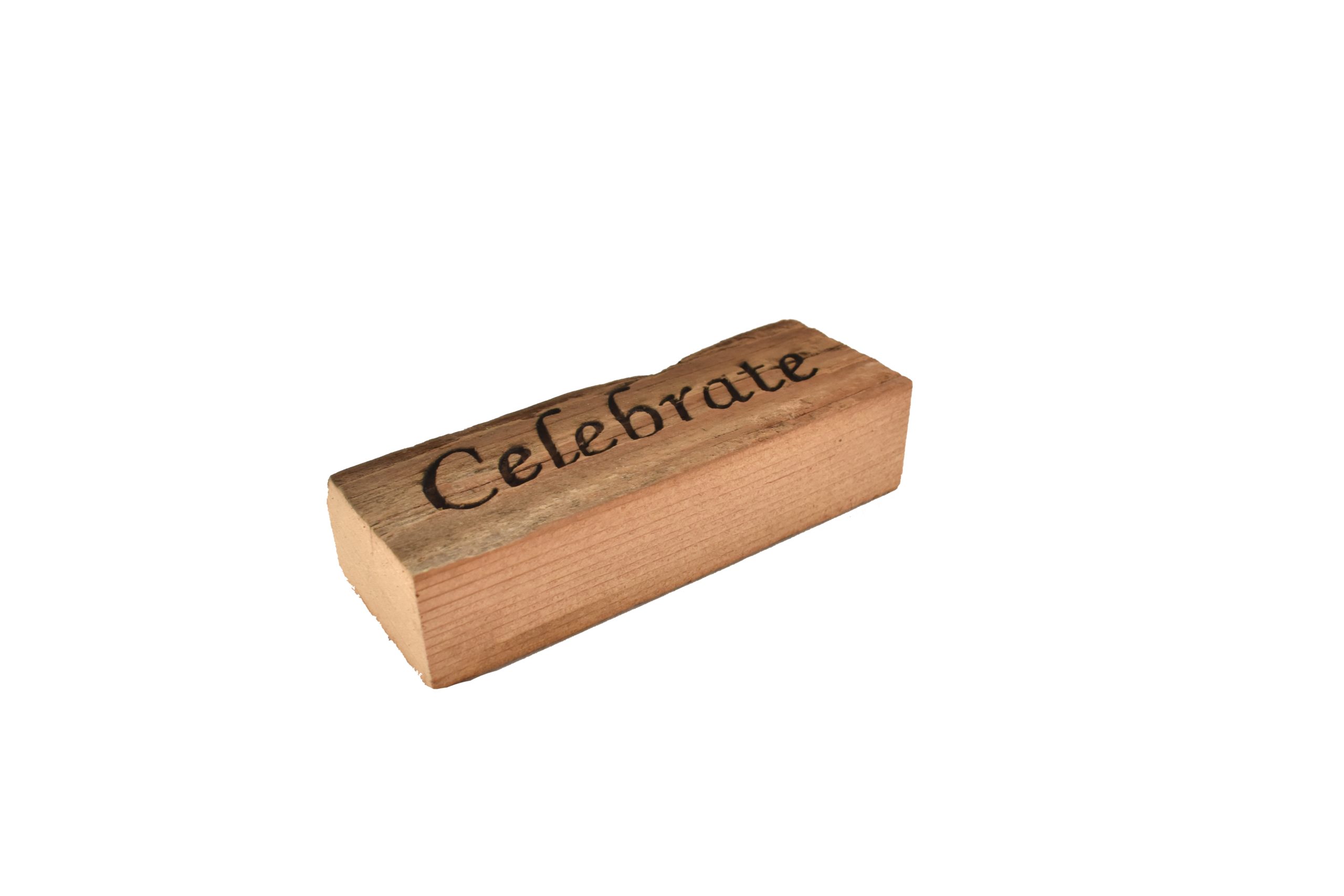 Our wood block signs are made from reclaimed wood from an over 100 year old barn and will look great in any home or cabin. Our “Celebrate” laser engraved wood block will remind you that there is something good to celebrate in each day.