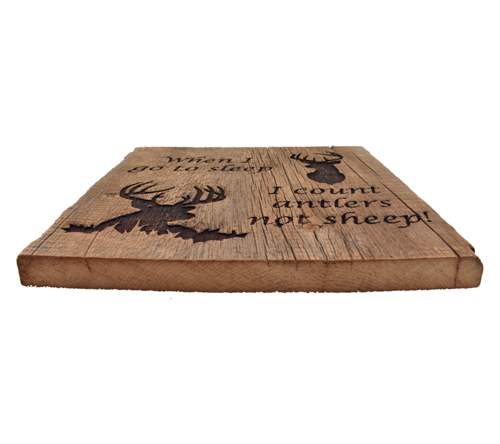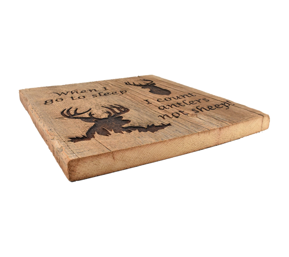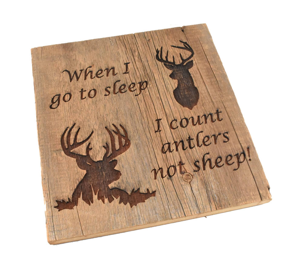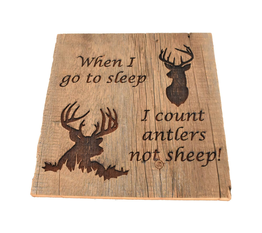 The Count Antlers barnwood sign from Whitetail Woodcrafters is a unique way to decorate your child’s room, cabin or taxidermy showroom. These rustic signs are handcrafted in our shop from barnwood from an over 100 year old barn for a quality and character you won’t find anywhere else. No matter where this laser engraved wood sign gets displayed, it is sure to impress all who see it.