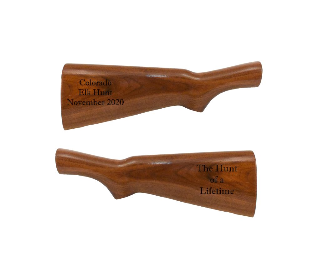 This custom engraved text gun stock engraving package from Whitetail Woodcrafters includes text engraving on both sides of your gun stock butt stock. Perfect for wedding or anniversary presents or even to memorialize a deceased family member or friend, our text gun stock engraving package will create a lasting way to to keep the memory of an event or person alive and close at heart.