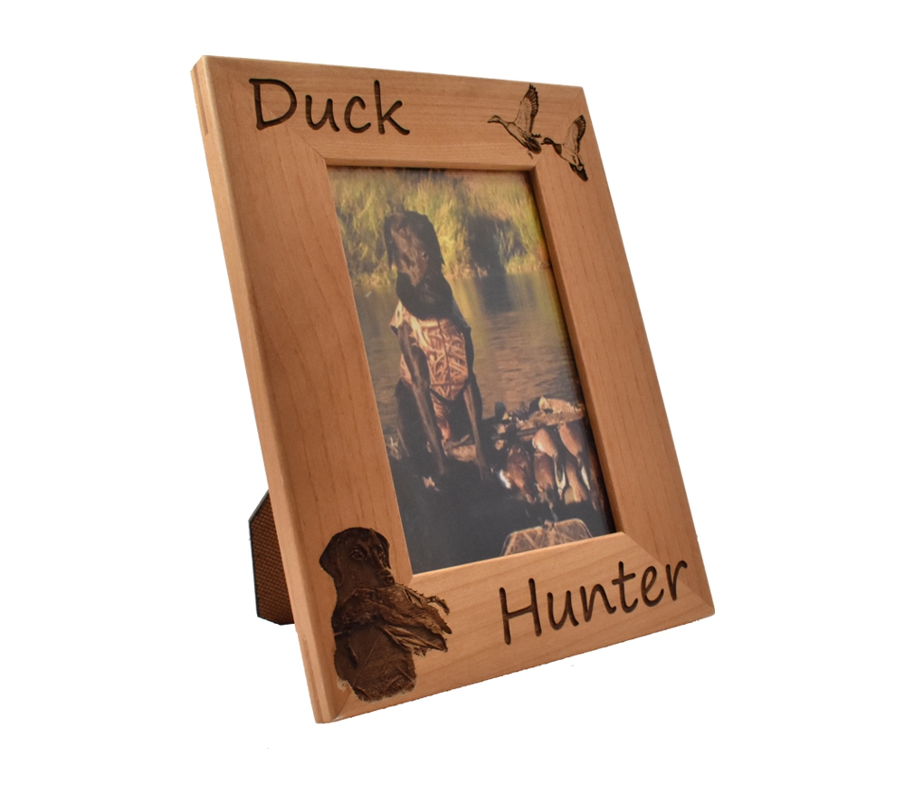 Show off your favorite duck hunting memories with a personalized hunting picture frame from Whitetail Woodcrafters. These laser-engraved wood frames are made from solid alder wood and are sure to make cool gifts for duck hunters of every kind. This engraved wooden picture frame is able to hold 4Ă—6, 5Ă—7, or 8Ă—10 inch photos and can be hung on the wall or set on a flat surface using the attached stand.