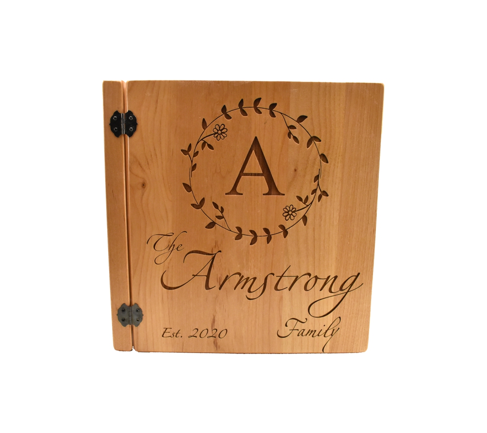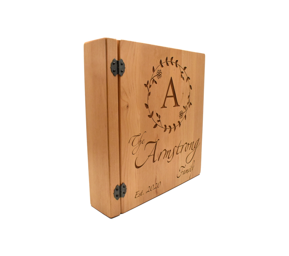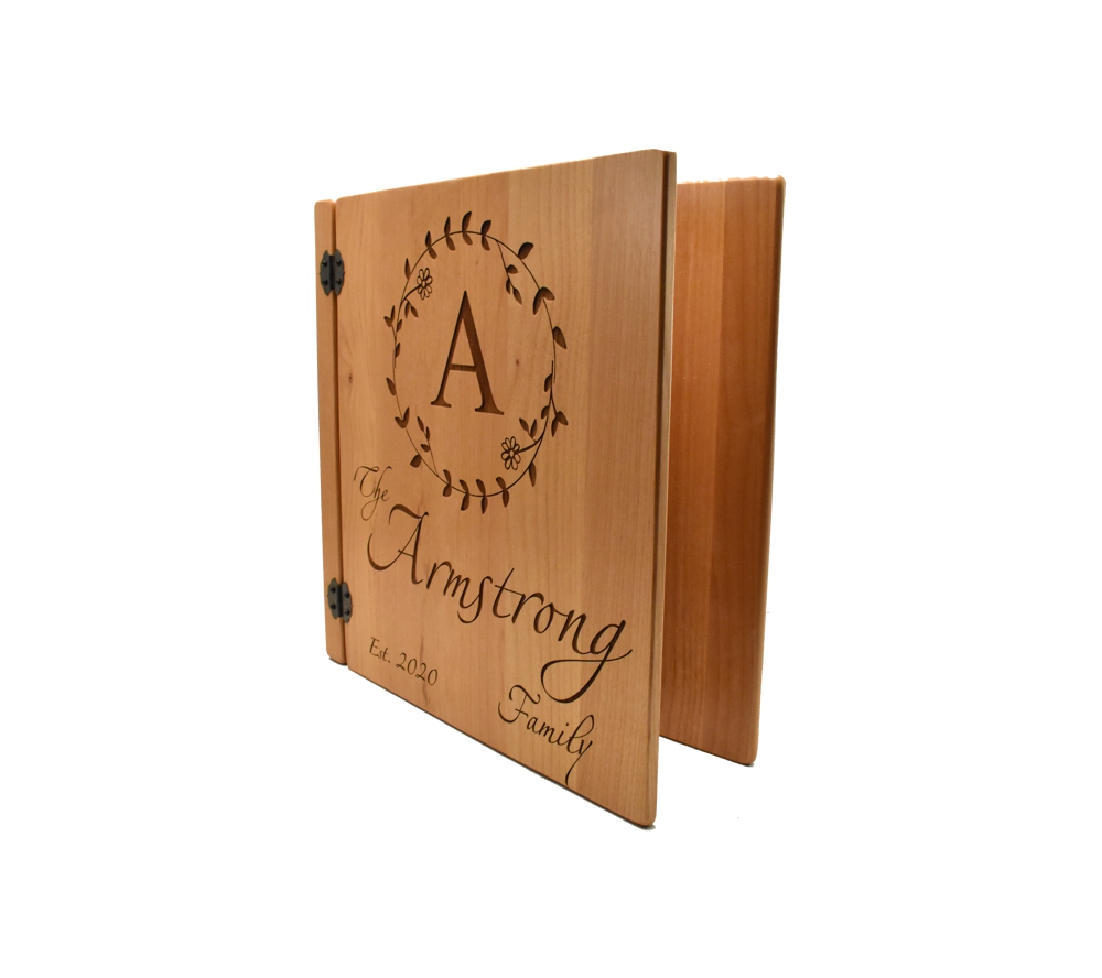 This personalized photo album with our Family Monogram design is the perfect place to collect all of your family’s memories. Crafted of solid alder, our engraved picture albums are made to last for generations. All of our 3 ring wooden photo albums feature a standard 3 ring binder insert that can hold any 8.5″ x 11″ page. This allows you to make a custom album, scrapbook, guestbook, or a mixture of these pages for a completely unique display. We have a variety of sizes of page inserts available for purchase with your album as well.