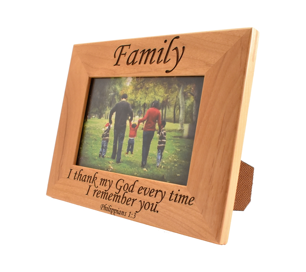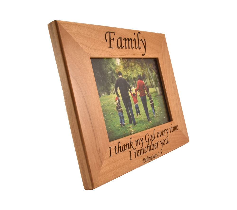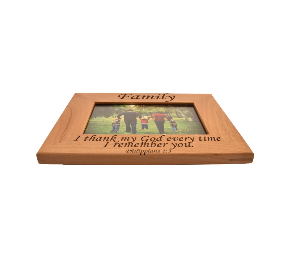Show how thankful you are for your family with our “Philippians 13” personalized picture frame from Whitetail Woodcrafters. All of our laser engraved wood frames are made from solid alder wood and will be treasured by you and your family forever. Our engraved wooden picture frames are available to hold a 4×6, 5×7, or 8×10 inch photo and can be hung on the wall or set on a flat surface using the attached stand.