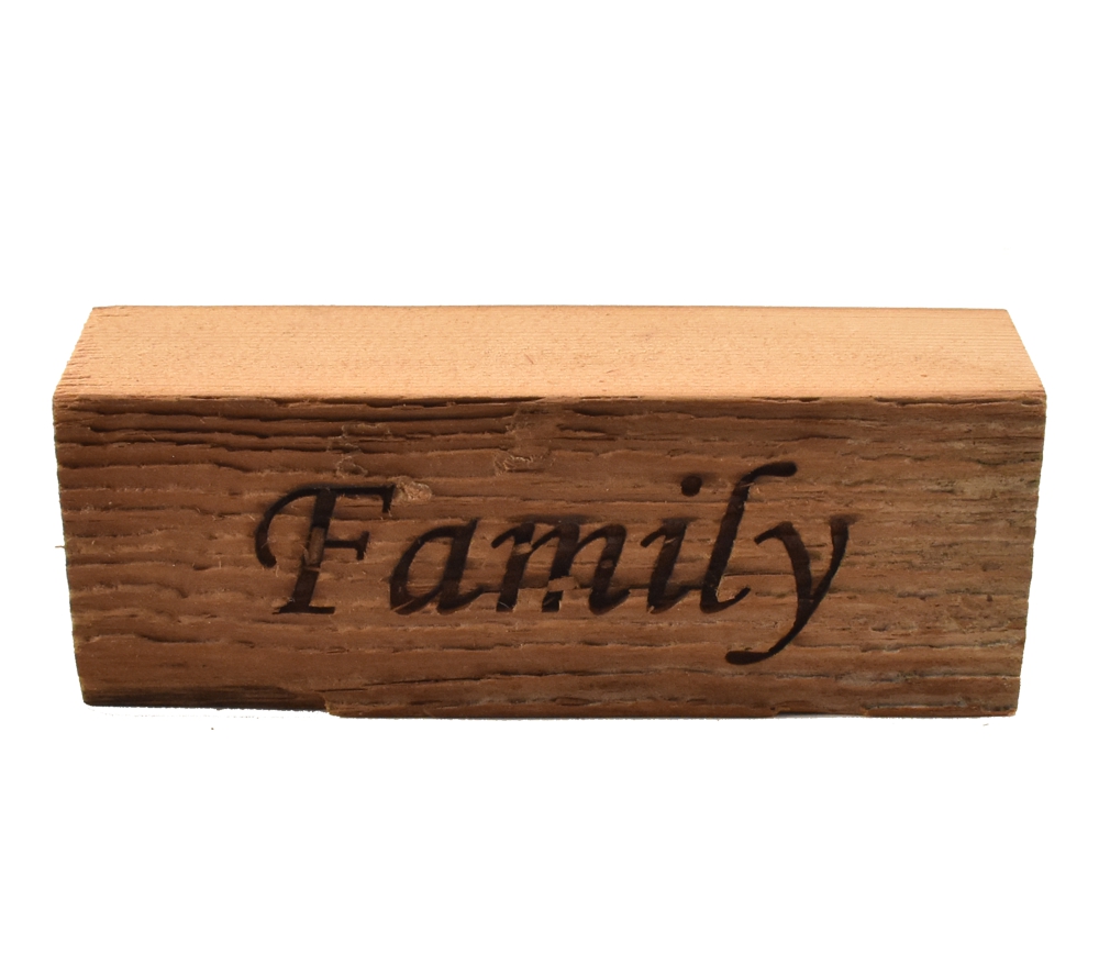 Our wood block signs are made from reclaimed wood from an over 100 year old barn and will look great in any home or cabin. Our “Family” laser engraved wood block is a great reminder of the love that you share with the people that are most important in your life.