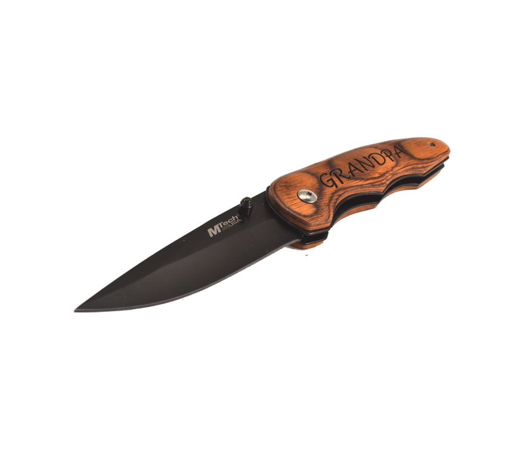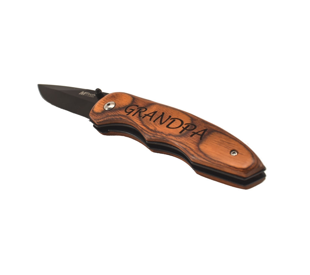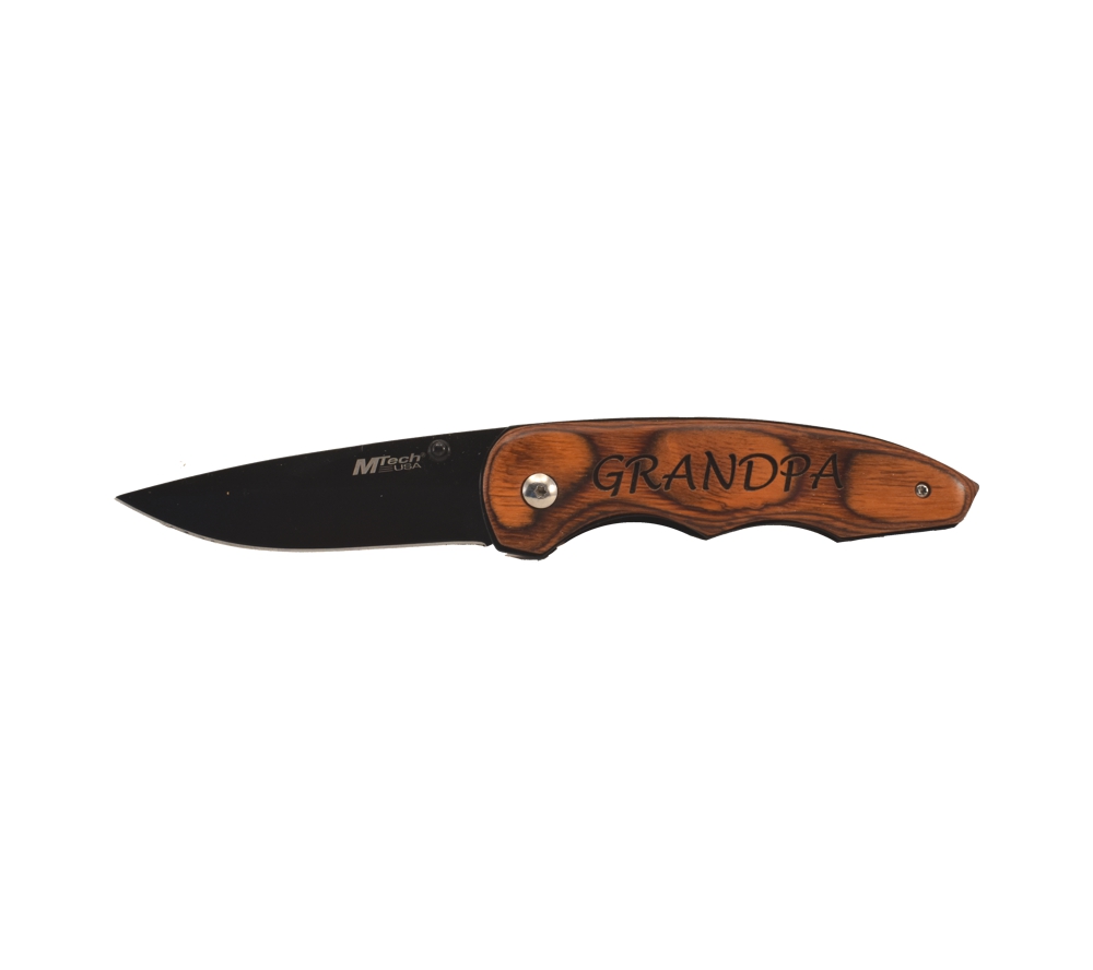 Grandpa engraved pocket knives from Whitetail Woodcrafters are a gift that will always be used for years to come. This Grandpa personalized pocket knife will make a wonderful gift. This high quality knife features a rosewood handle and a black stainless steel stay-sharp blade.
