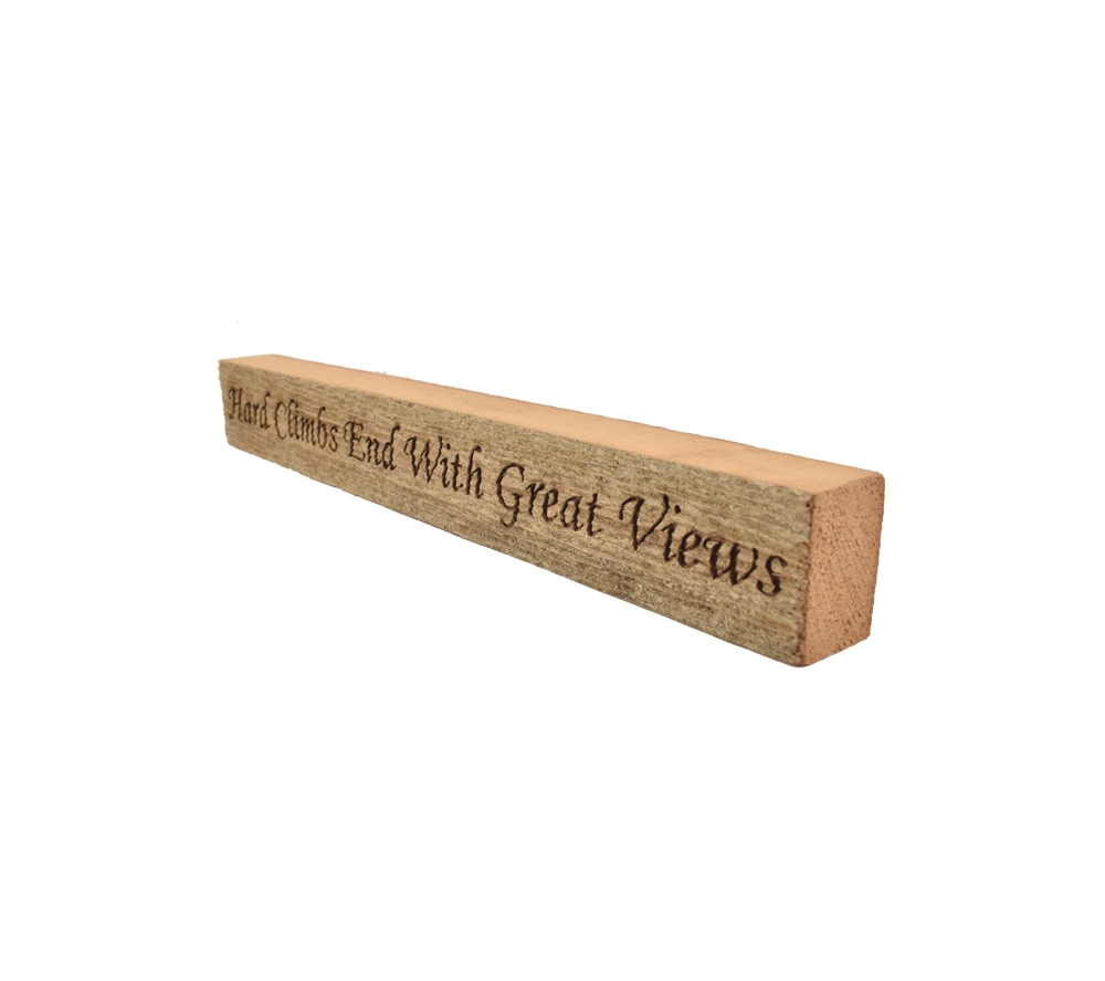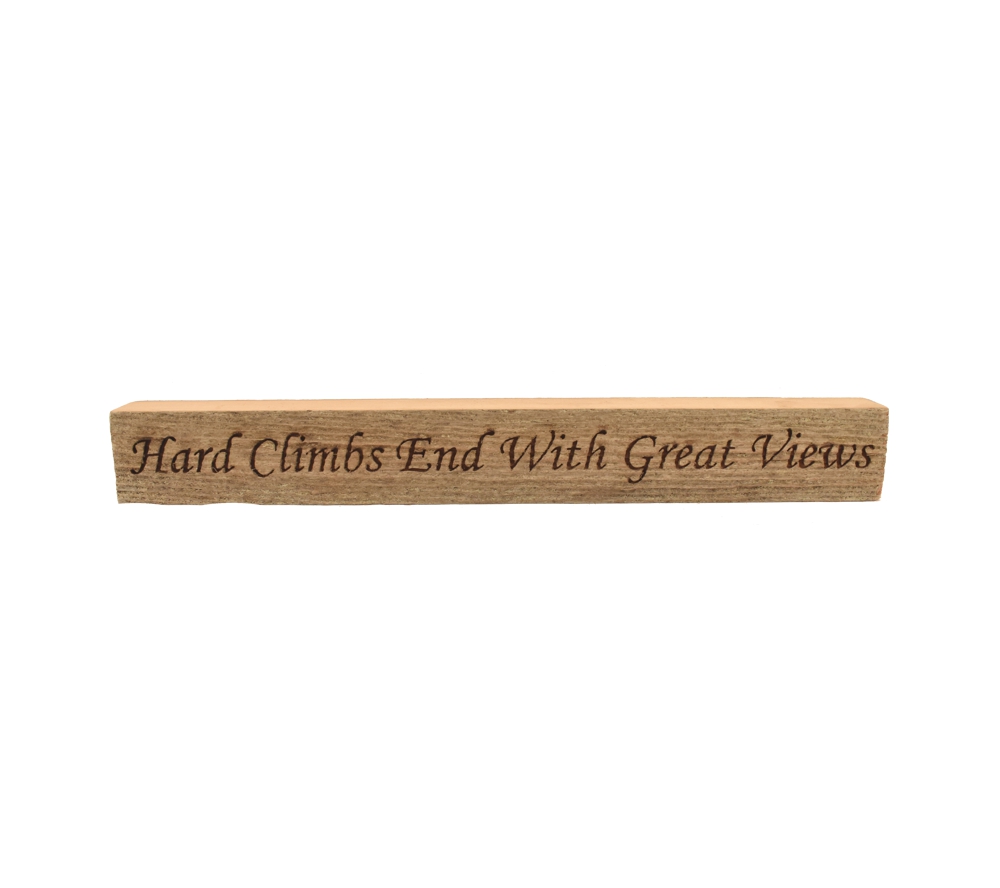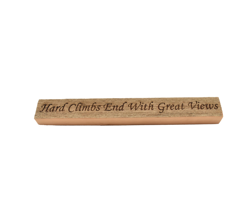 Our wood block signs are made from reclaimed wood from an over 100 year old barn and will look great in any home or cabin. Our “Hard Climbs End with Great Views” laser engraved wood block is a great reminder to keep pushing towards the reward at the end of your journey.