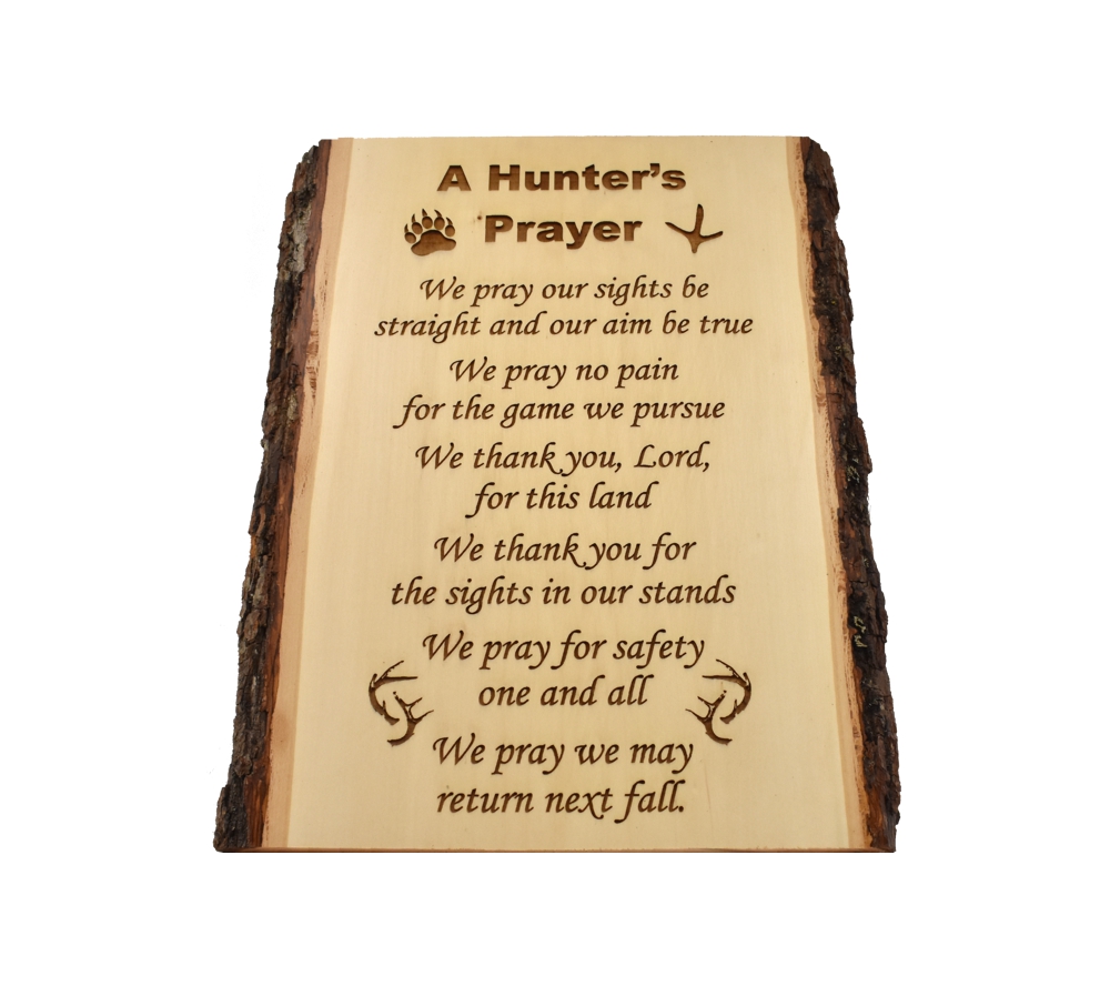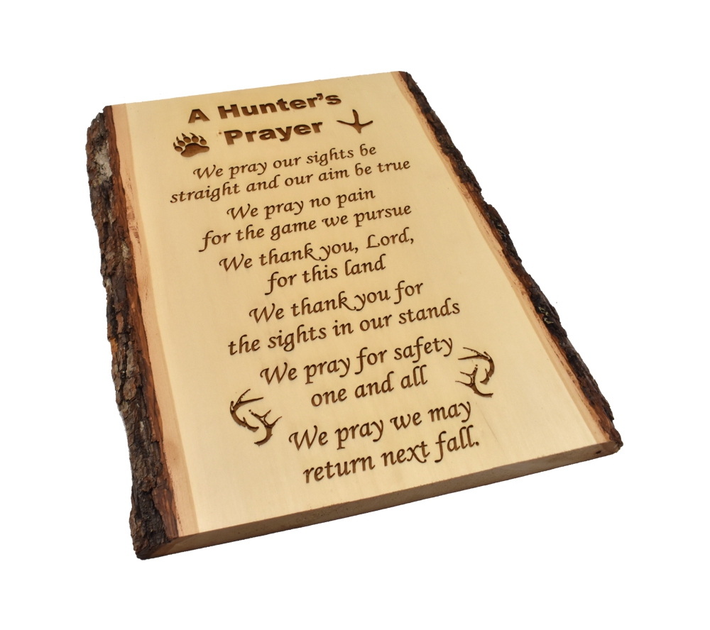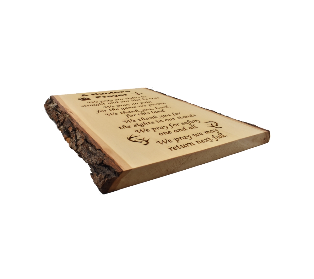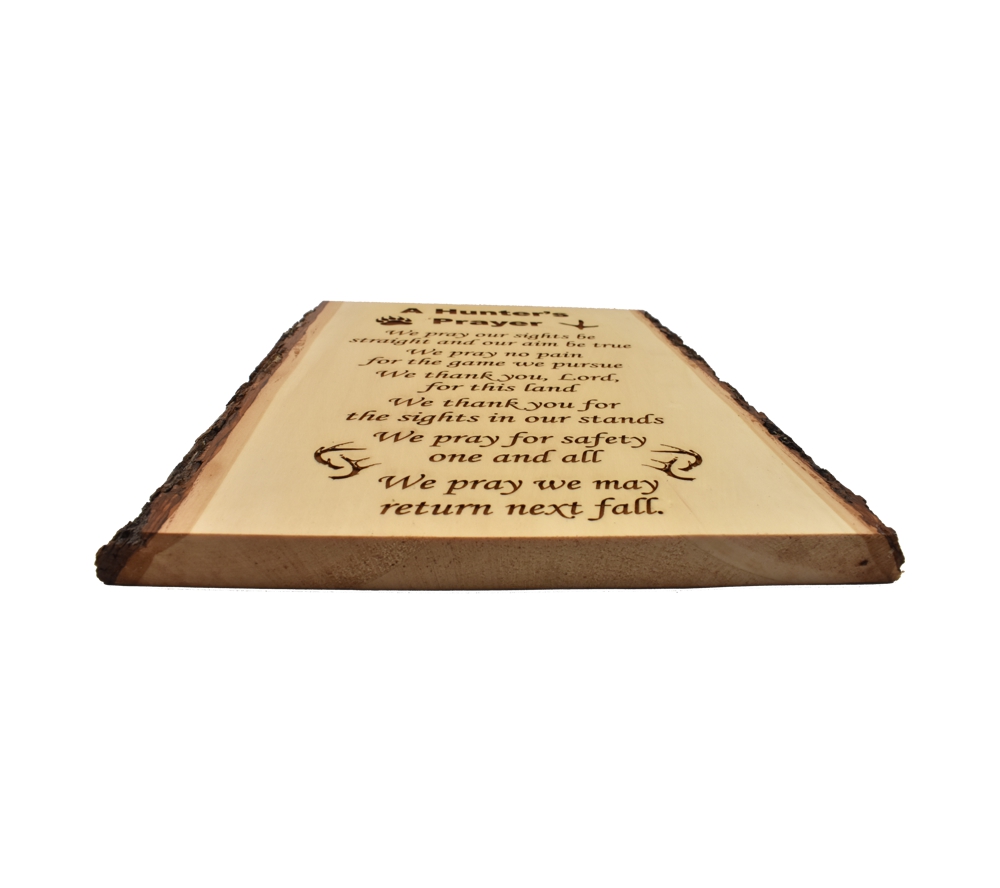 The Hunter’s Prayer live edge sign from Whitetail Woodcrafters is a unique way to decorate your cabin or taxidermy showroom. These rustic signs are handcrafted from solid basswood in our shop for a quality you won’t find anywhere else. Whether you give this laser engraved wood sign as a gift or display it in your own cabin or man cave, it is sure to impress all who see it.