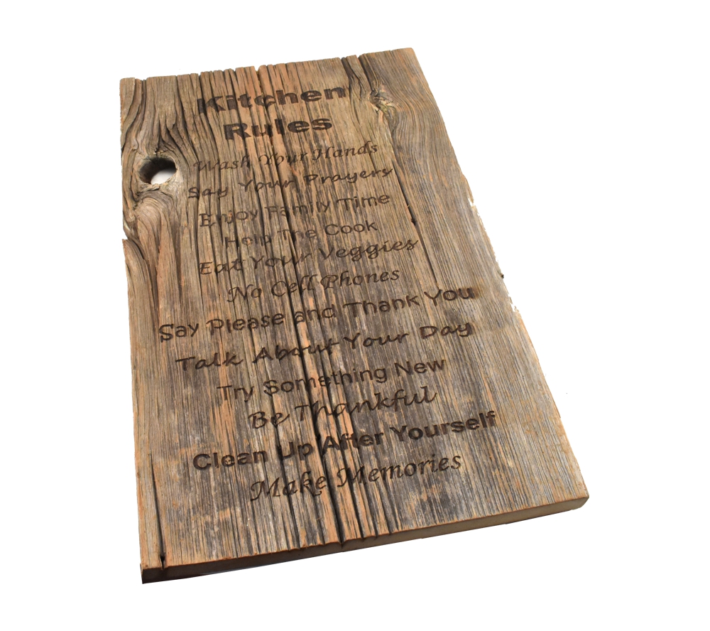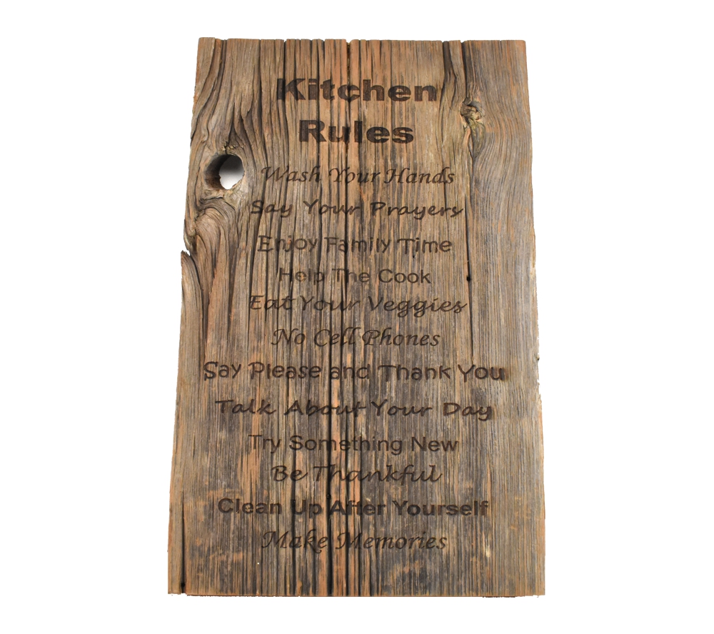 The Kitchen Rules barnwood sign from Whitetail Woodcrafters is a unique way to decorate your home or cabin, and makes a great gift. These rustic signs are handcrafted in our shop from barnwood from an over 100 year old barn for a quality and character you won’t find anywhere else. Our laser engraved wood signs are designed to last for years to come.