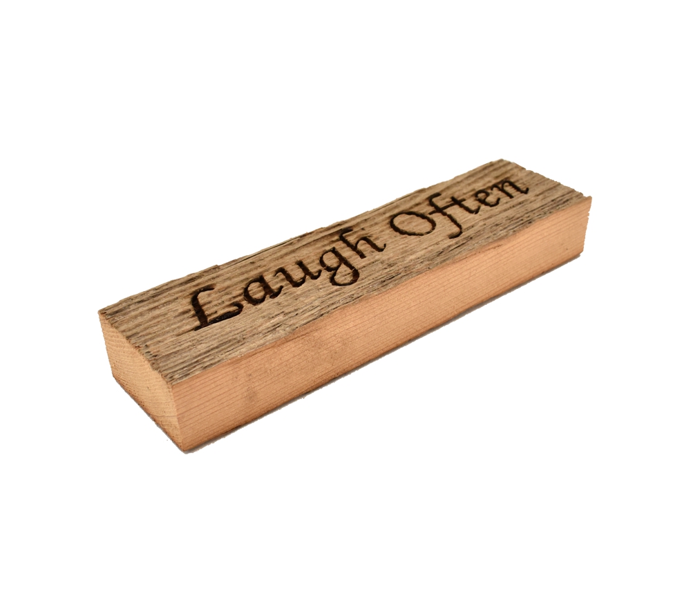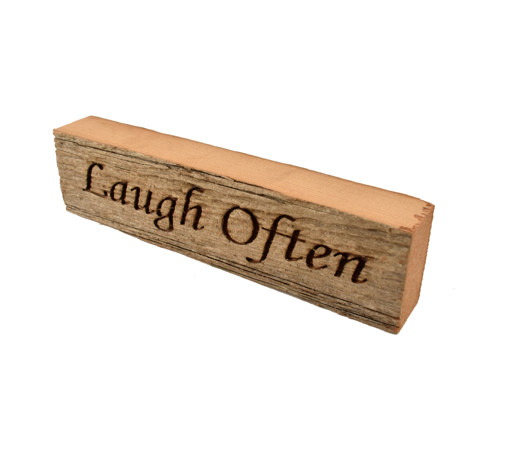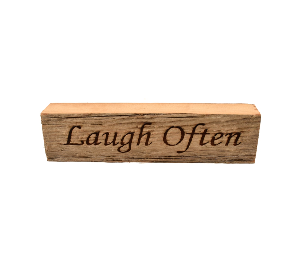 Our wood block signs are made from reclaimed wood from an over 100 year old barn and will look great in any home or cabin. Our “Laugh Often” laser engraved wood block is the perfect reminder that laughter makes any day better.
