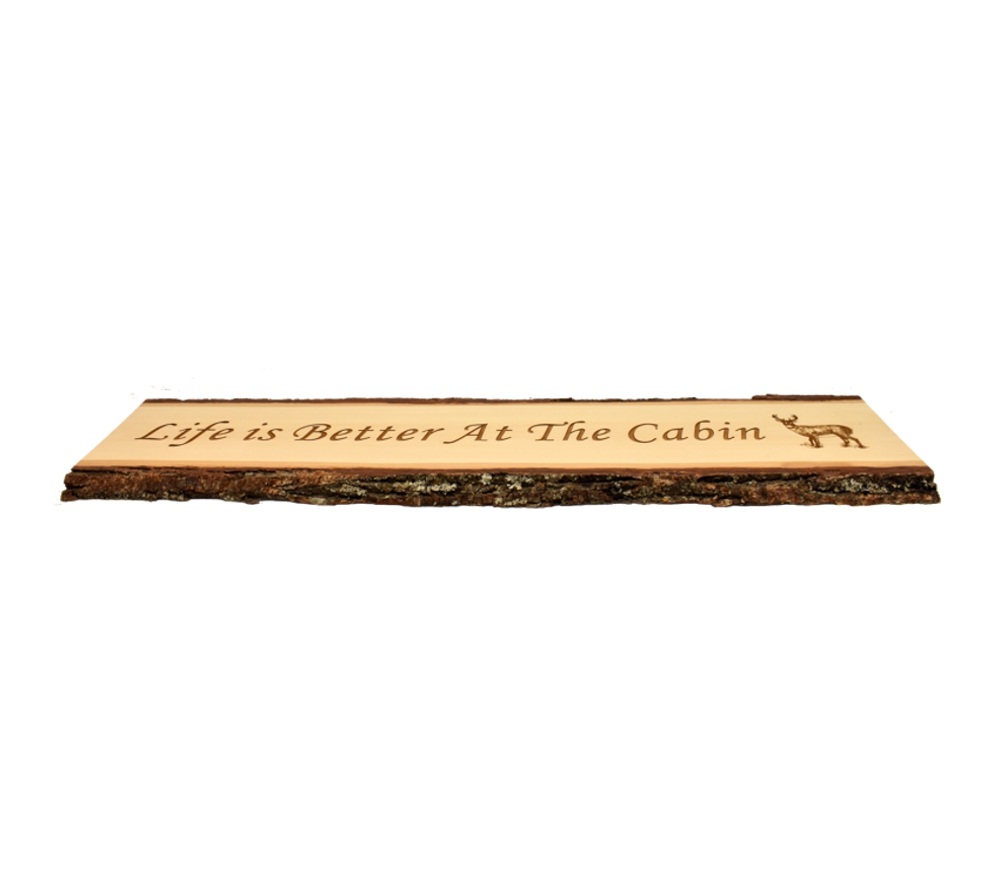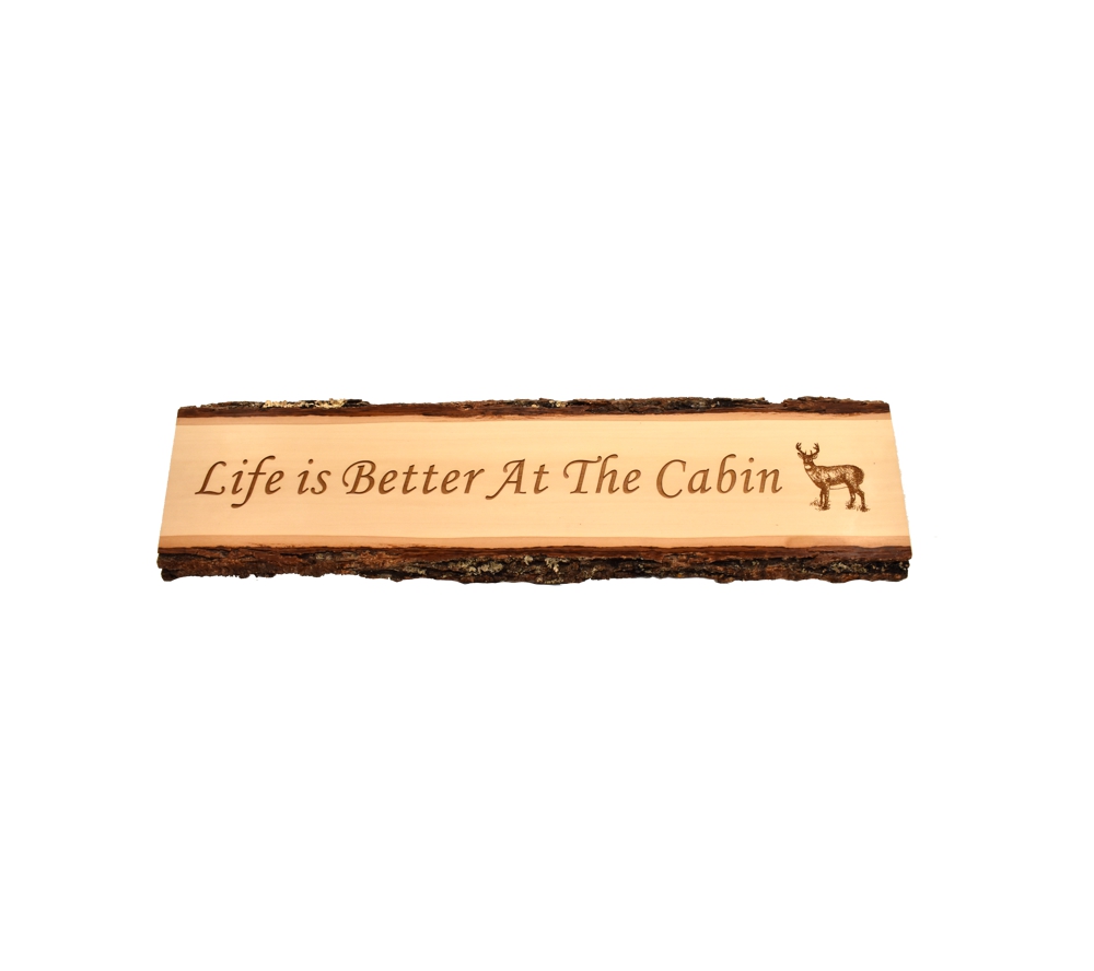 The Life at the Cabin live edge door topper from Whitetail Woodcrafters is a unique way to decorate your cabin or  taxidermy showroom. These rustic signs are handcrafted from solid basswood in our shop for a quality you won’t find anywhere else. Whether you give this laser engraved wood sign as a gift or display it in your own cabin, it is sure to impress all who see it.