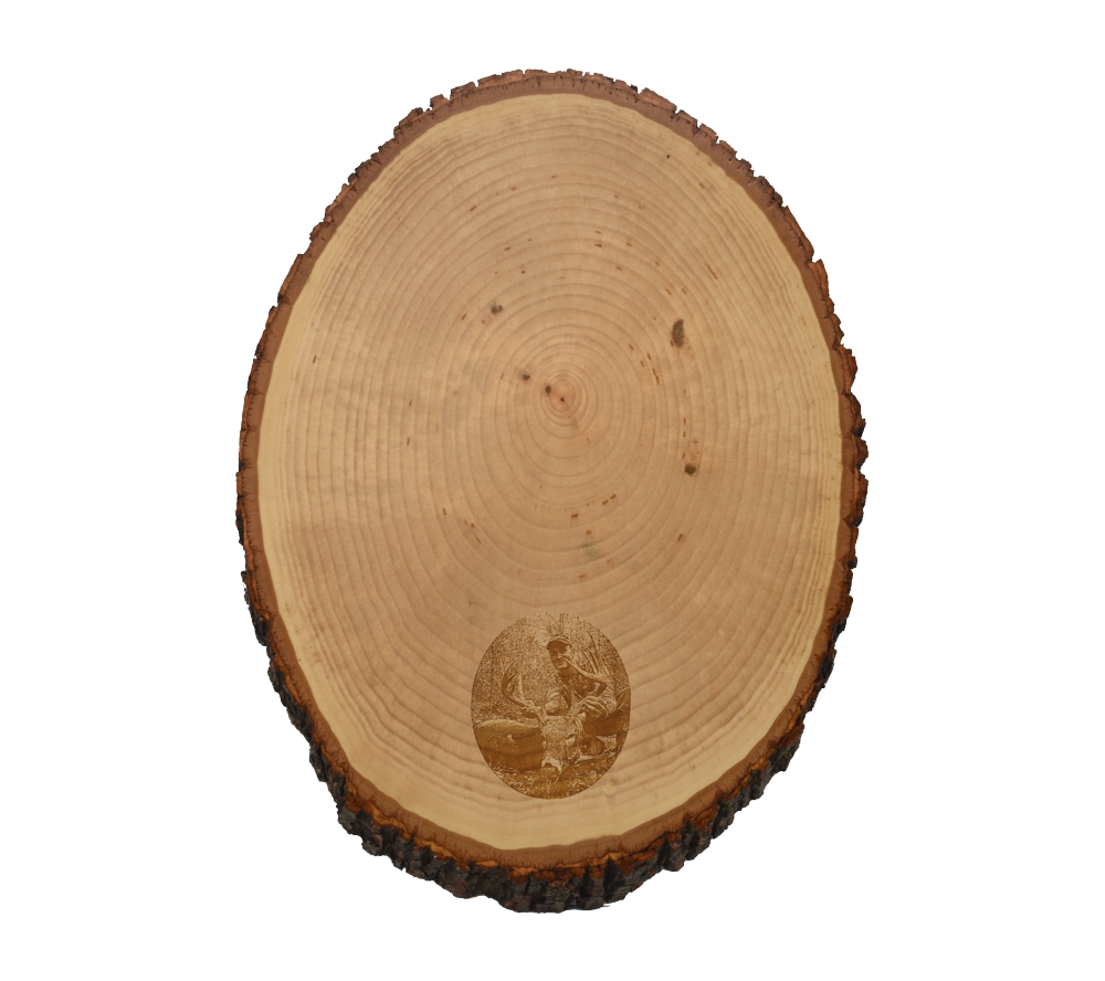 Create an impressive rustic display for your deer antlers by mounting them on a custom photo engraved 10×13 live edge oval antler mounting plaque from Whitetail Woodcrafters. This taxidermy plaque is handcrafted in our shop from solid basswood. It is then engraved with a personal photo for a treasured reminder of that special hunt.