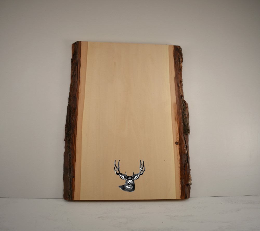 Mount your deer antlers on a personalized 10×13 live edge rectangle antler mounting plaque from Whitetail Woodcrafters to create an impressive rustic display. This taxidermy plaque is handcrafted in our shop from solid basswood. It is then engraved with text or an image for a treasured reminder of that special hunt. This plaque allows up to 3 lines of text or 1 image.