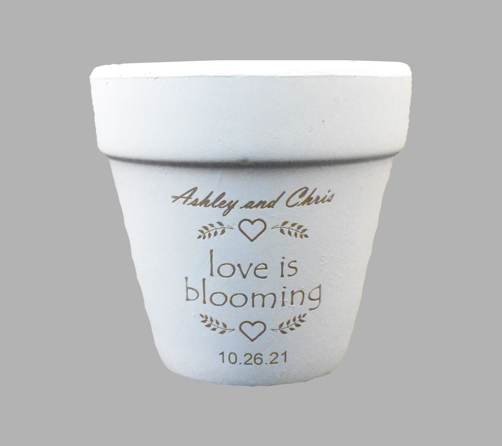 Love Is Blooming Engraved White Clay Pot Wedding Favor