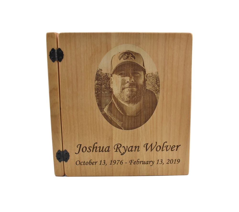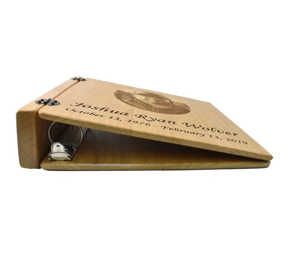 Create a beautiful reminder of a loved one who passed away with a custom engraved photo album from Whitetail Woodcrafters. All of our 3 ring wood photo albums are handcrafted from solid alder wood and feature a standard 3 ring binder insert that can hold any 8.5” x 11″ page. This allows you to make a completely custom photo album, scrapbook, or funeral guest book. We have a variety of sizes of page inserts available for purchase with your album as well.