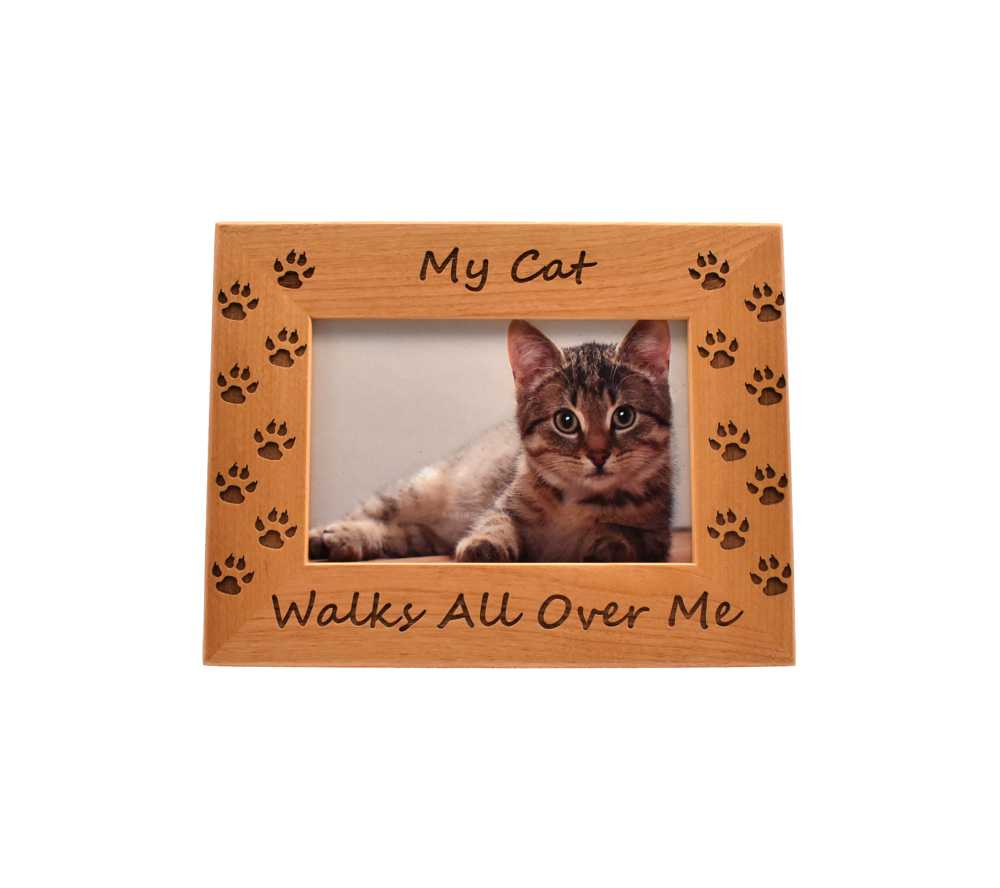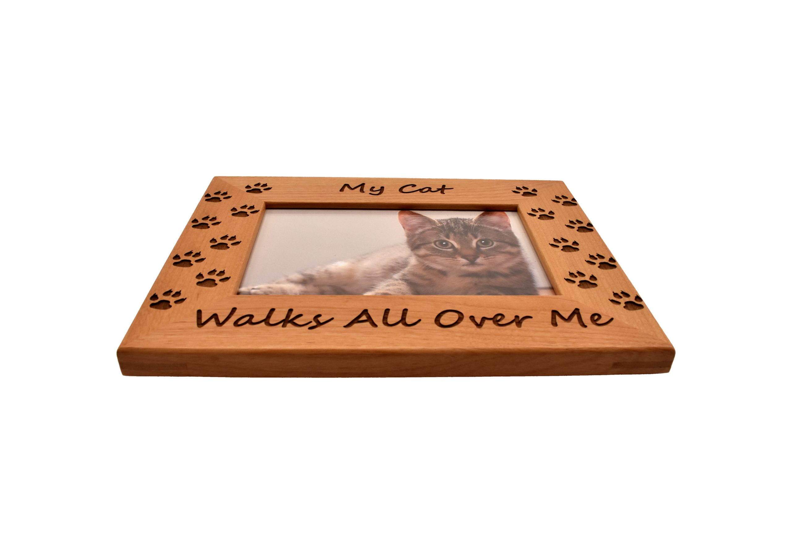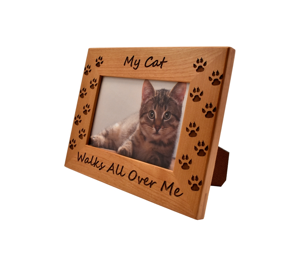 You can show off your favorite four legged friend with a personalized cat picture frame from Whitetail Woodcrafters. All of our laser engraved wood picture frames are made from solid alder wood and will be cherished by your family forever, even after your pet has passed on. This engraved wooden picture frame is available to hold a 4×6, 5×7, or 8×10 inch photo and can be hung on the wall or set on a flat surface using the attached stand. The words “My Cat” on the top of the frame can be replaced with your pet’s name by entering the name in the engraving text box.