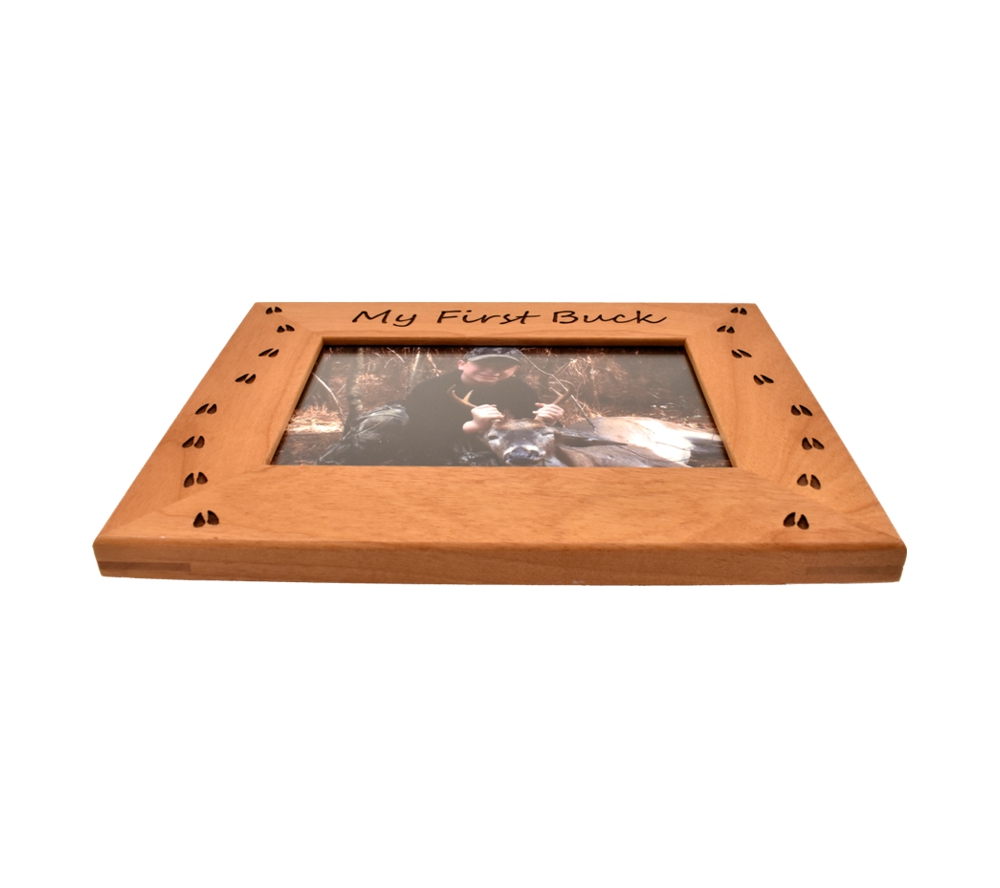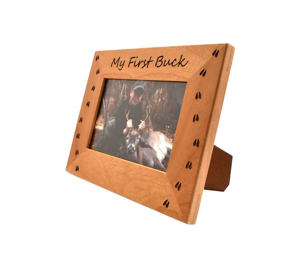 Show off your first buck to everyone with a personalized hunting picture frame from Whitetail Woodcrafters. This laser engraved wood frame is made from solid alder wood and will look great in your home or cabin. Our engraved wooden picture frames are available for a 4×6, 5×7, or 8×10 inch photo and can be hung on the wall or set on a flat surface using the attached stand. If you would like a name and/or date engraved on the frame, enter your text in the engraving text boxes.
