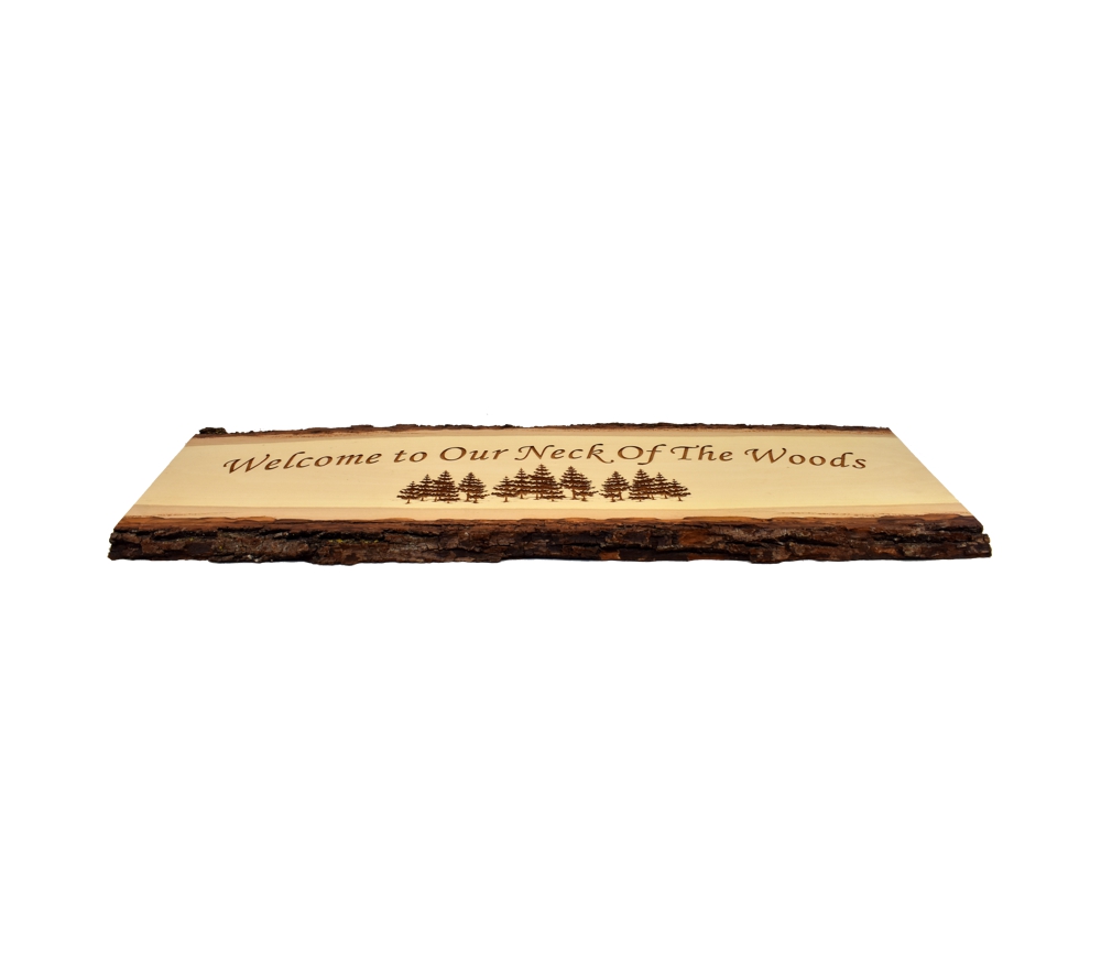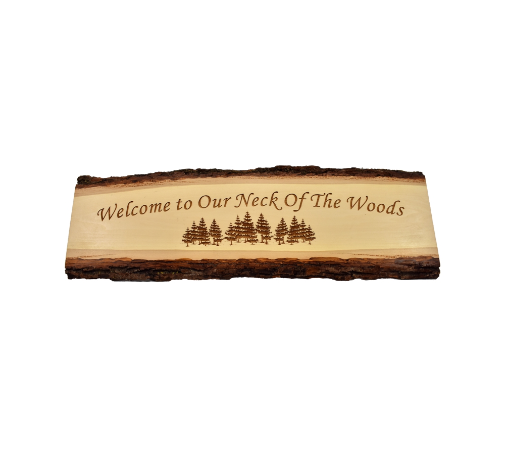 The Neck of the Woods live edge door topper from Whitetail Woodcrafters is a unique way to decorate your home or cabin. These rustic signs are handcrafted in our shop from solid basswood for a quality and character you won’t find anywhere else. Whether you give this laser engraved wood sign as a gift or display it in your own cabin, it is sure to impress all who see it.