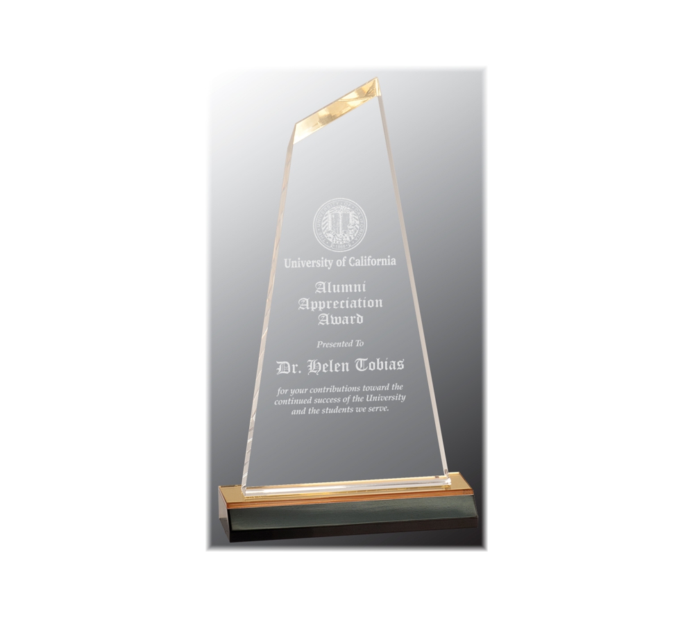 Our custom acrylic corporate award is a freestanding award that can be used to honor distinguished team members. These personalized awards are constructed from solid acrylic and feature a gold base with a choice of three different sizes. Create unique, laser engraved, acrylic awards to recognize the deserving people in your organization.