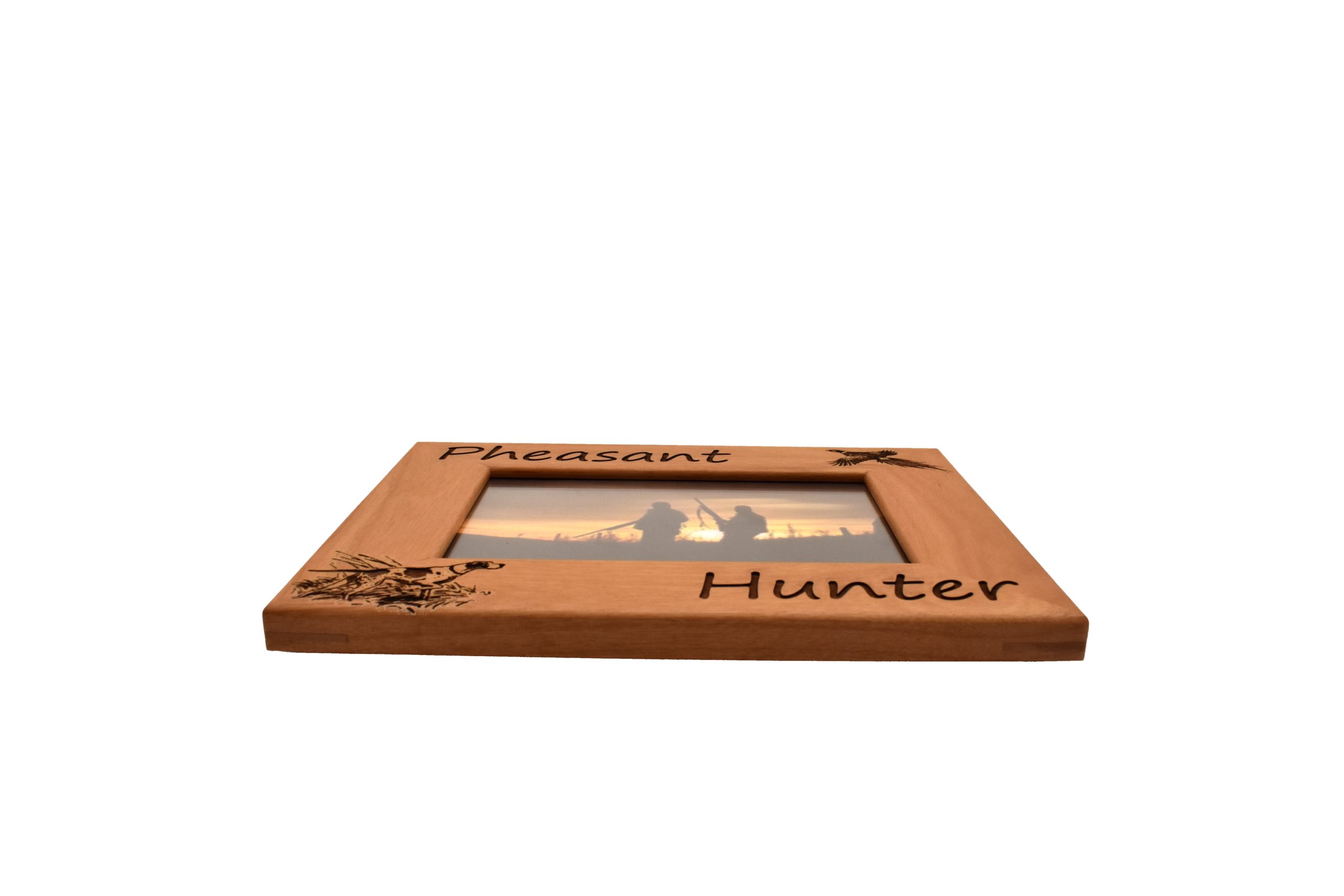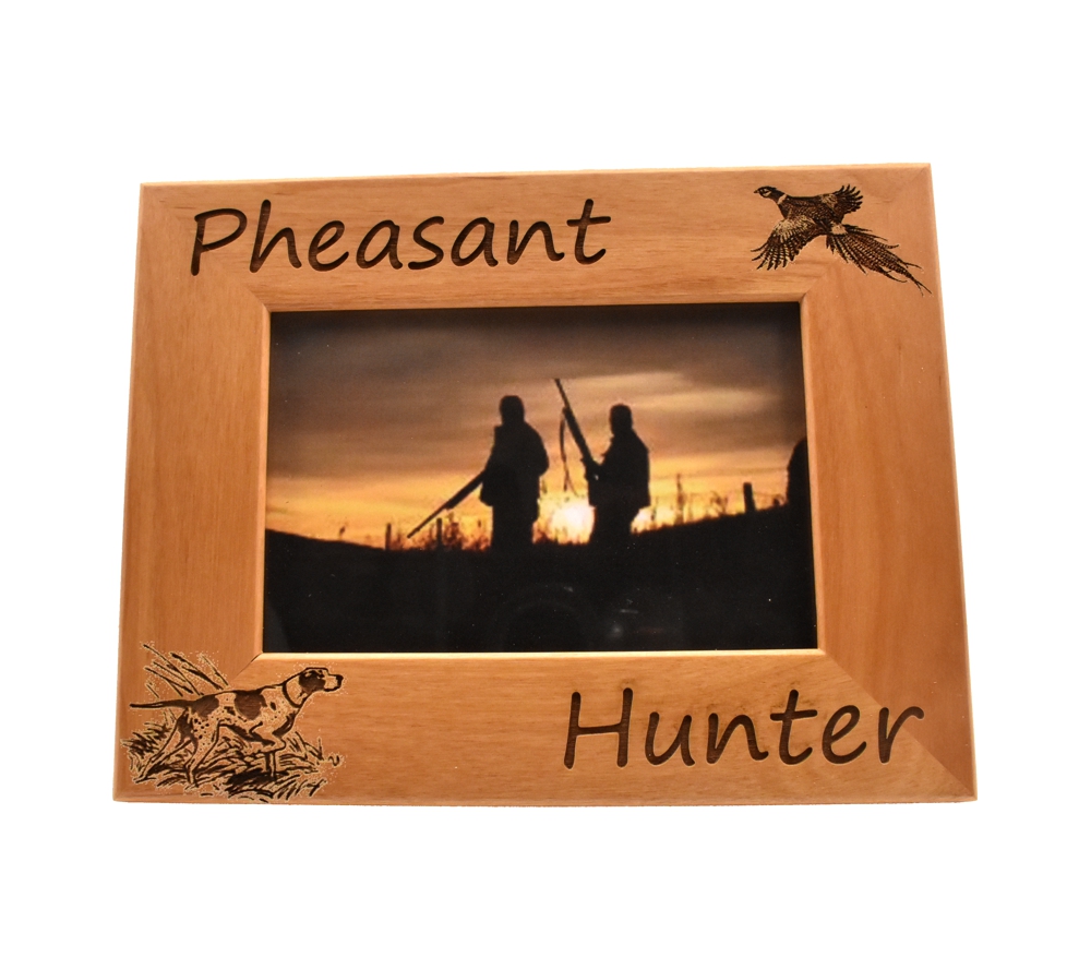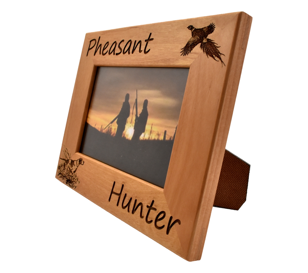 Show everyone your favorite pheasant hunting memories with personalized hunting picture frames from Whitetail Woodcrafters. This laser engraved wood frame is crafted from solid alder wood and will look great in your home, office, cabin, or display room. Our engraved wooden picture frames are available to hold a 4×6, 5×7, or 8×10 inch photo and can be hung on the wall or set on a flat surface using the attached stand.