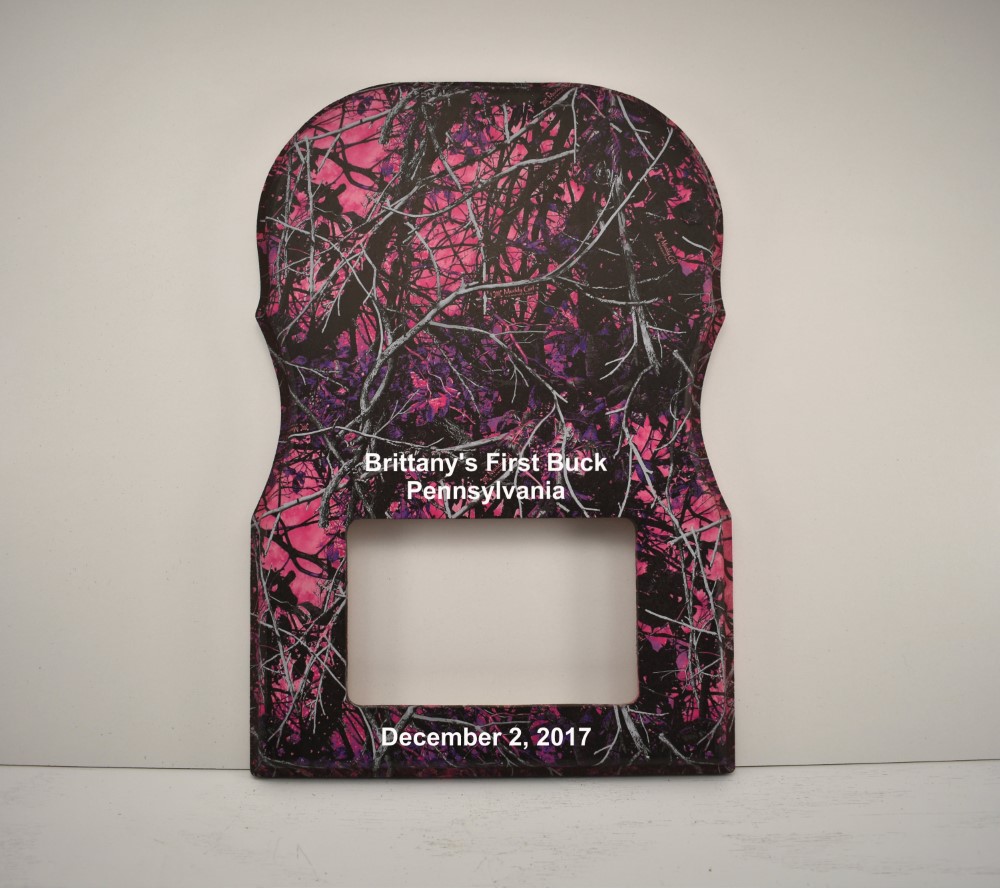 Note: A heavy duty metal hanger is attached to the back for easy wall hanging. Antlers and taxidermy mounting kit not included. We will choose the font color that will be most visible on the camo pattern you have selected. After we receive your order, we will create a design for your custom engraving and send you a copy for your approval. When you approve the design, we will engrave your item and ship it to you.