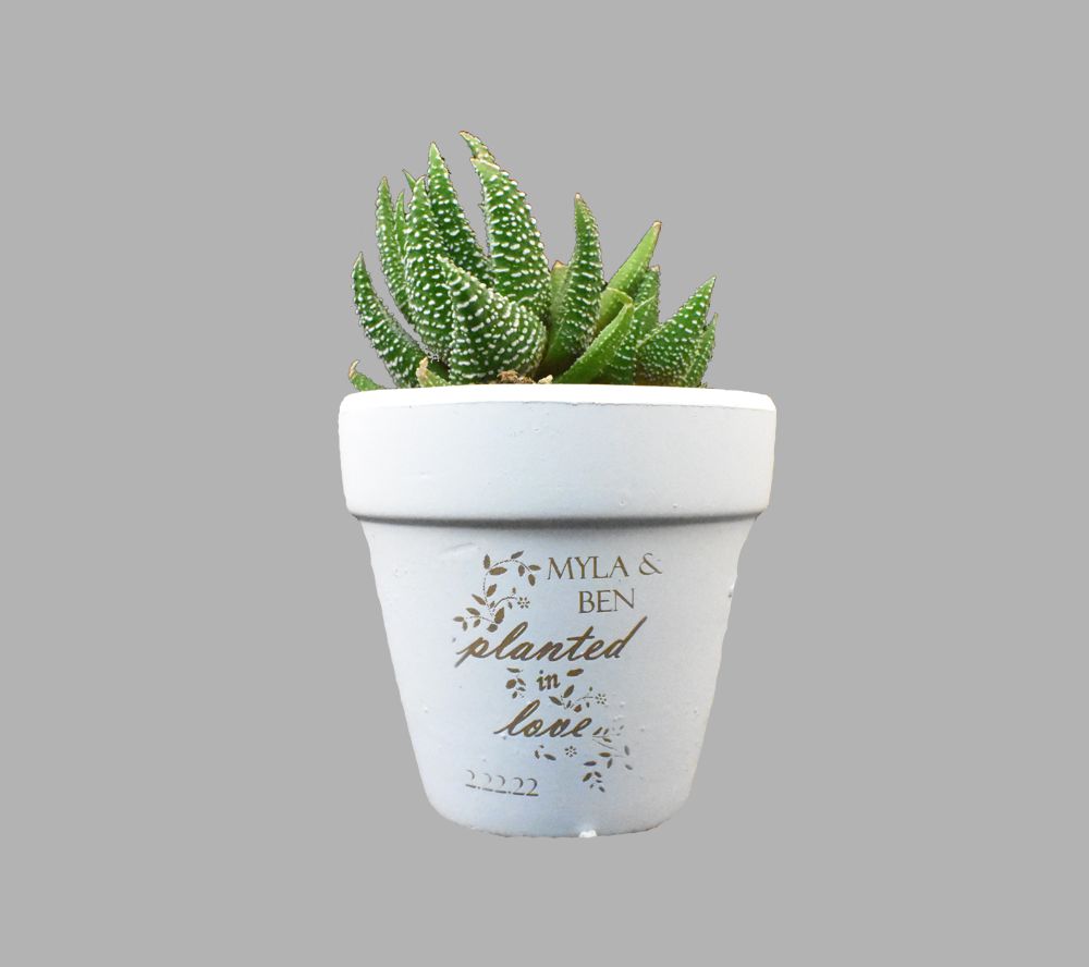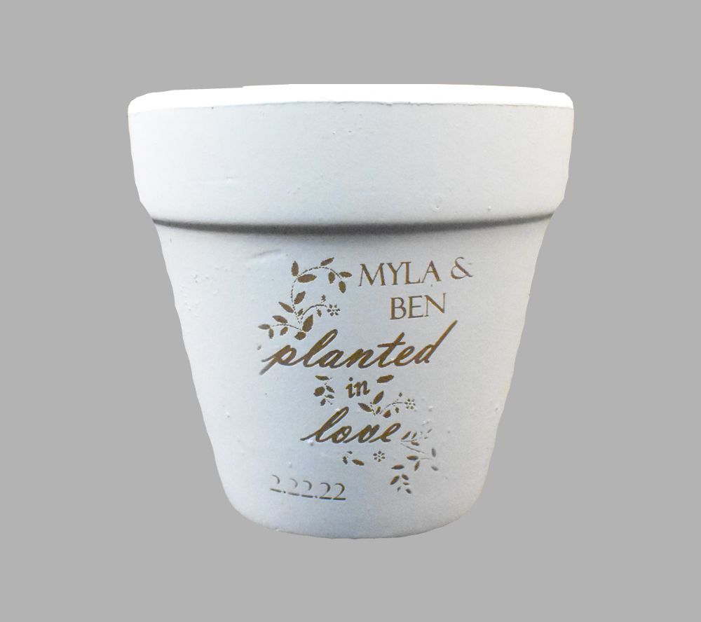 Planted In Love Engraved White Clay Pot Wedding Favor