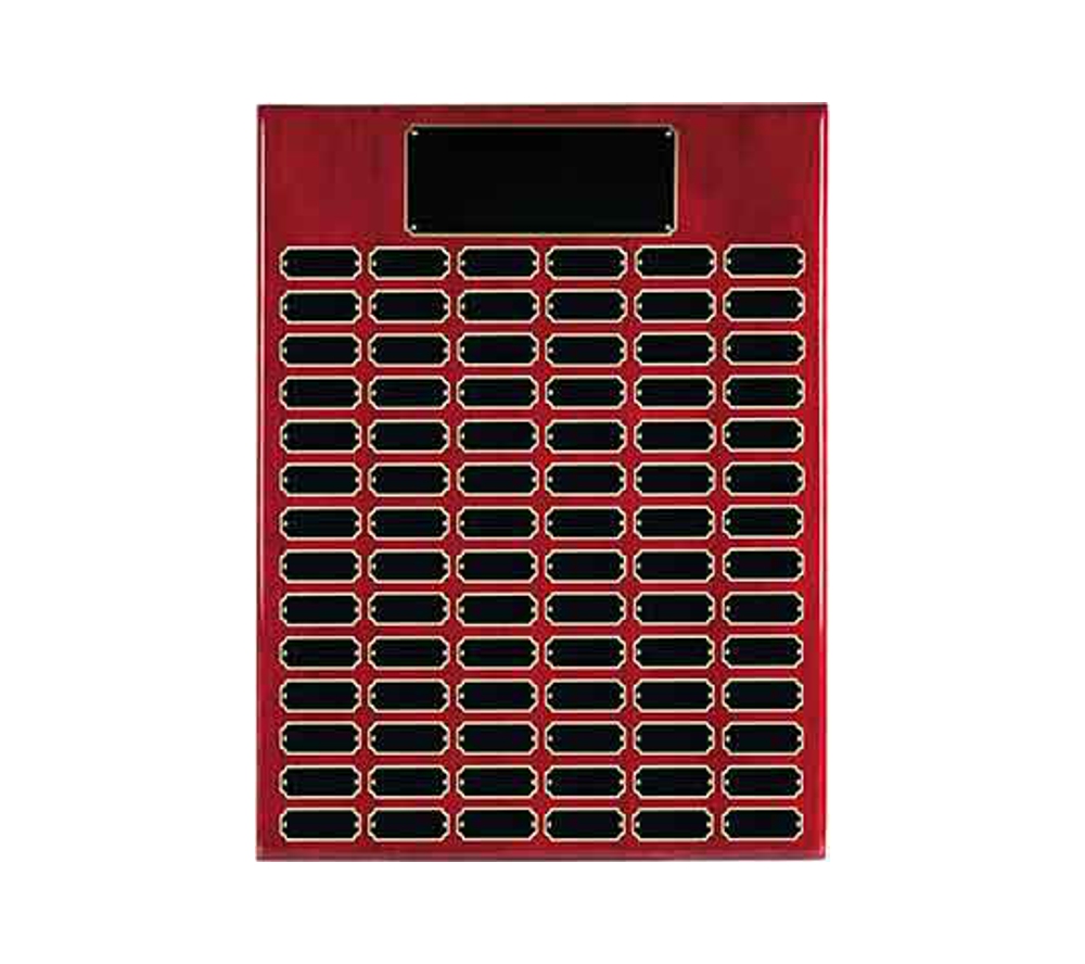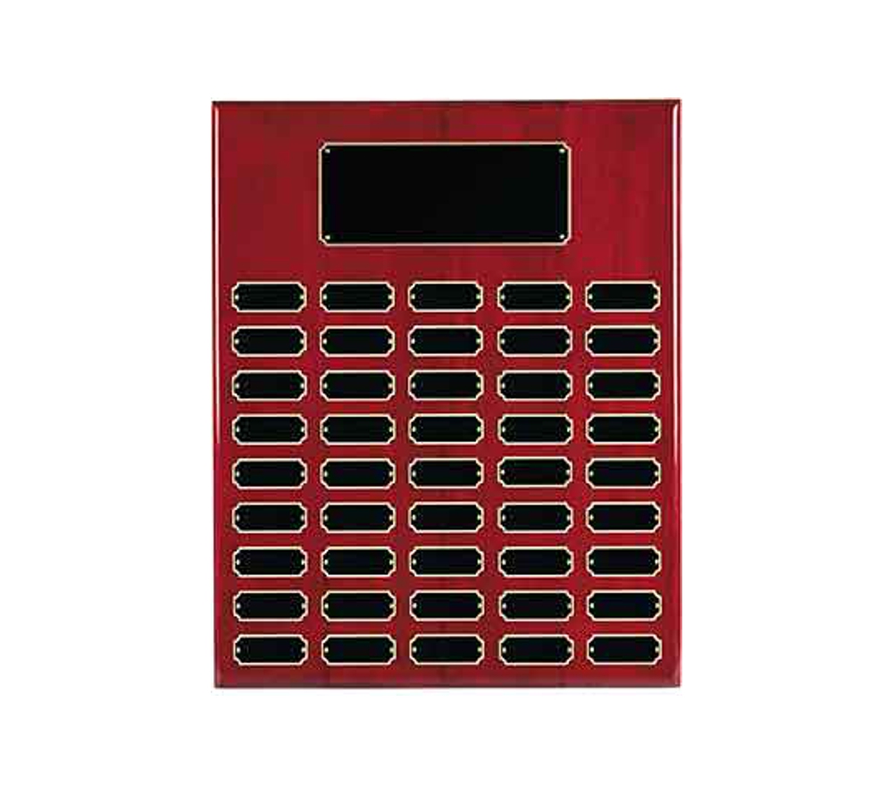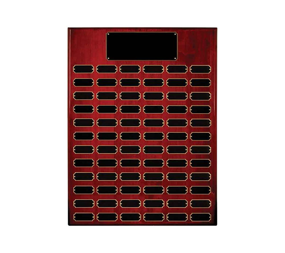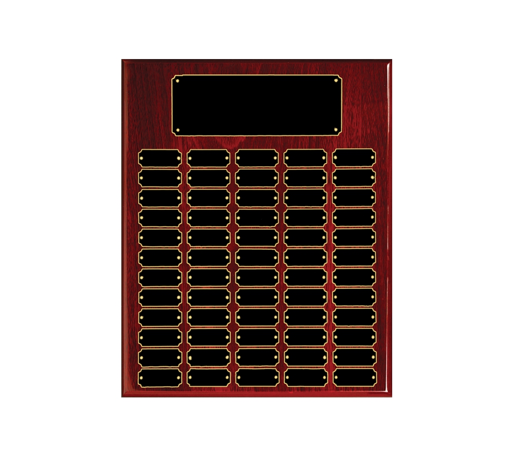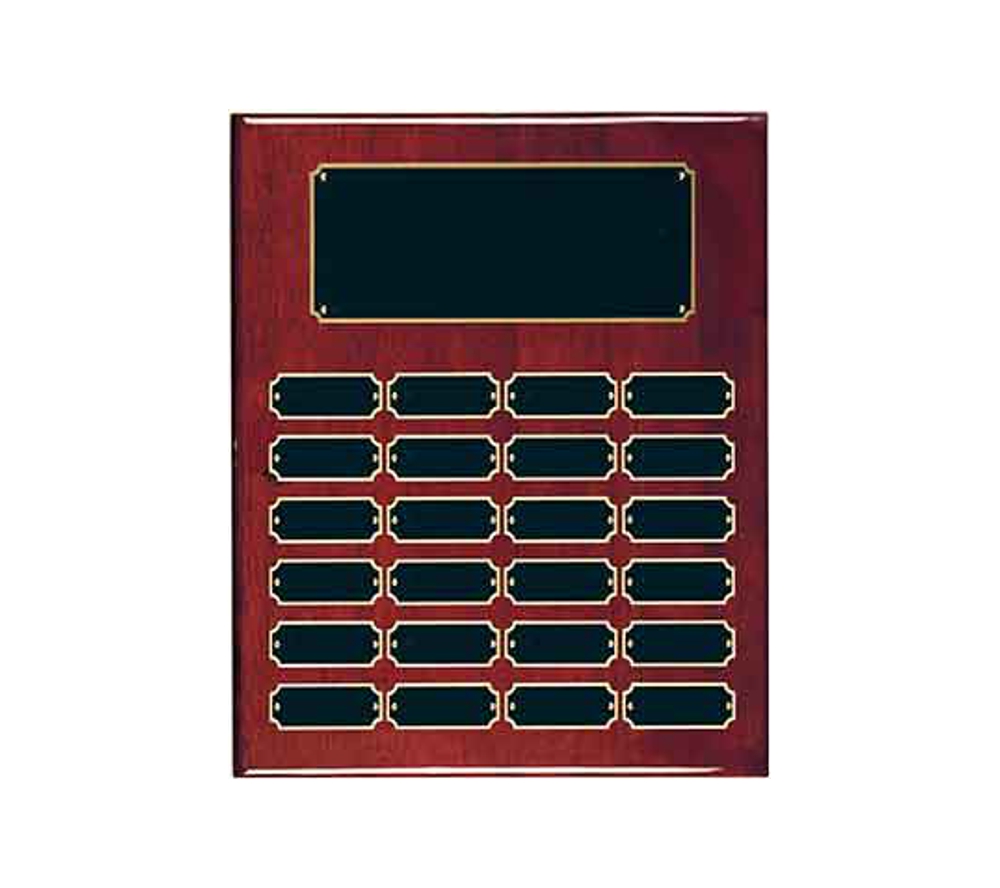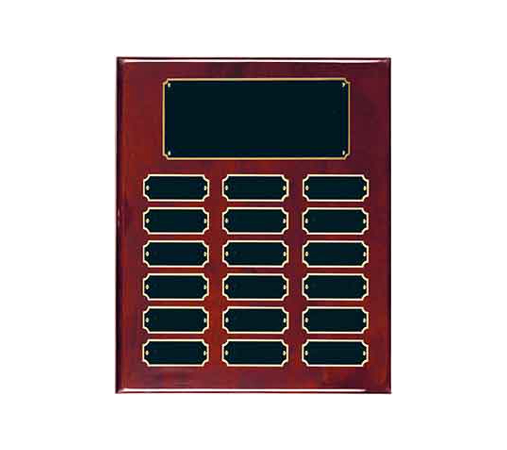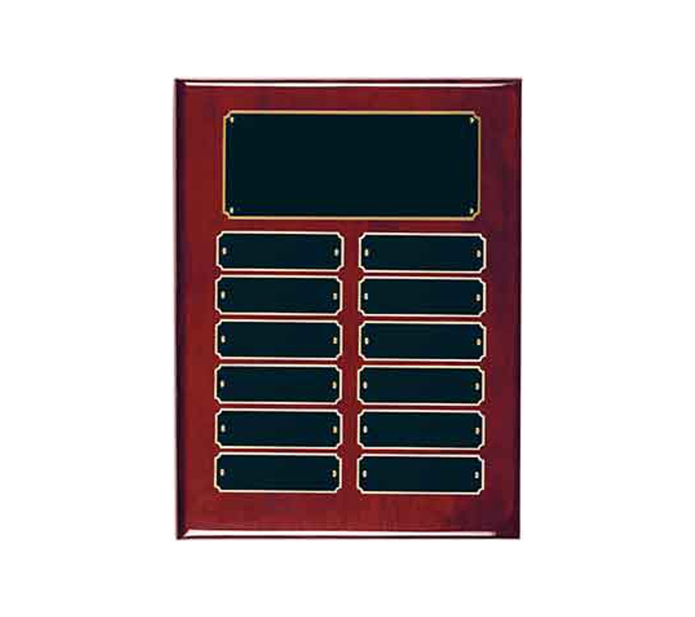 Our rosewood finish perpetual corporate award is a plaque that can be used to recognize distinguished people at recurring events. Crafted of solid teakwood, these unique award plaques feature a beautiful rosewood piano finish. Our perpetual awards come in an assortment of sizes with a varying amount of black brass recognition plates. If you are looking to start a plaque now and have additional plates engraved in the future, simply send the plates back to us with your order number and the engraving details and we will engrave them free of charge. Create one of a kind corporate award plaques to remember those special people in your organization.