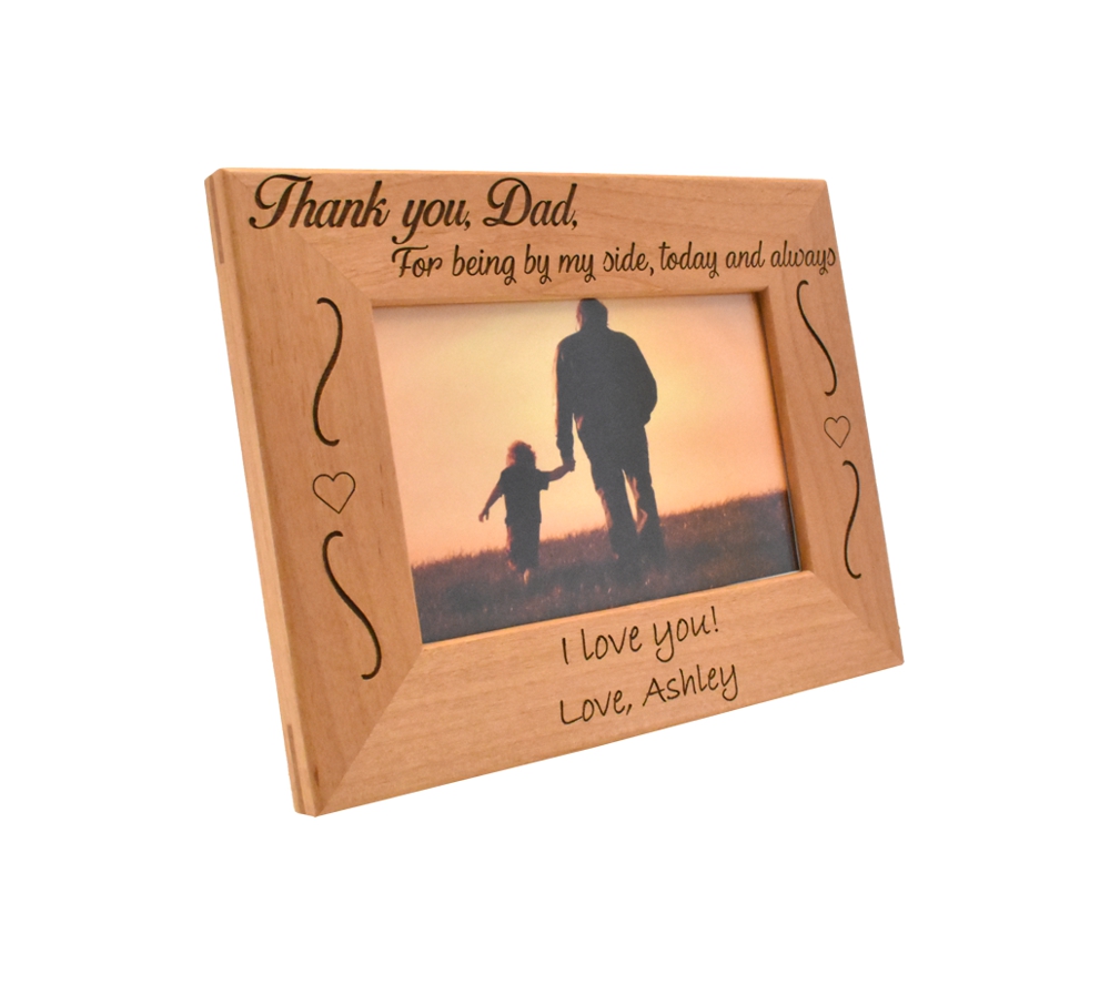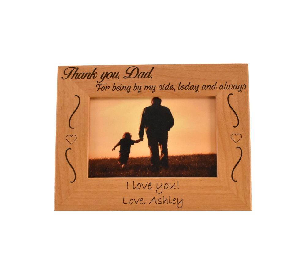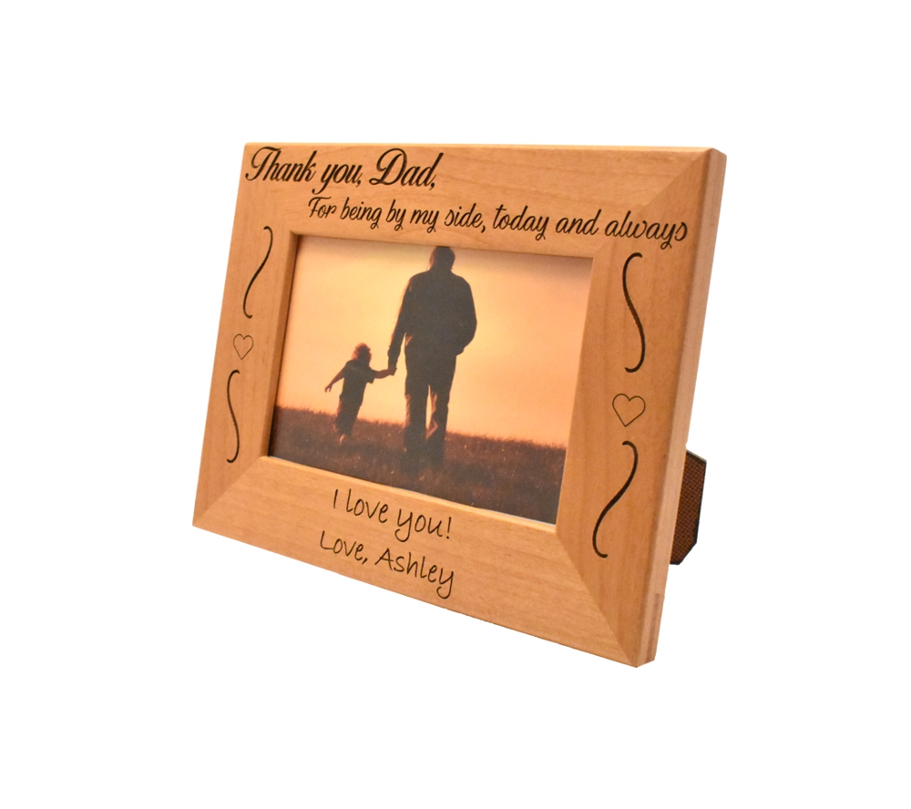 Show your dad how grateful you are for his support on your big day with a custom father of the bride gift from Whitetail Woodcrafters. Our solid wood personalized picture frames are handcrafted from premium alder wood and are built to last forever. This engraved picture frame is available to hold a 4×6, 5×7, or 8×10 inch photo and can be hung on the wall or set on a flat surface using the attached stand.