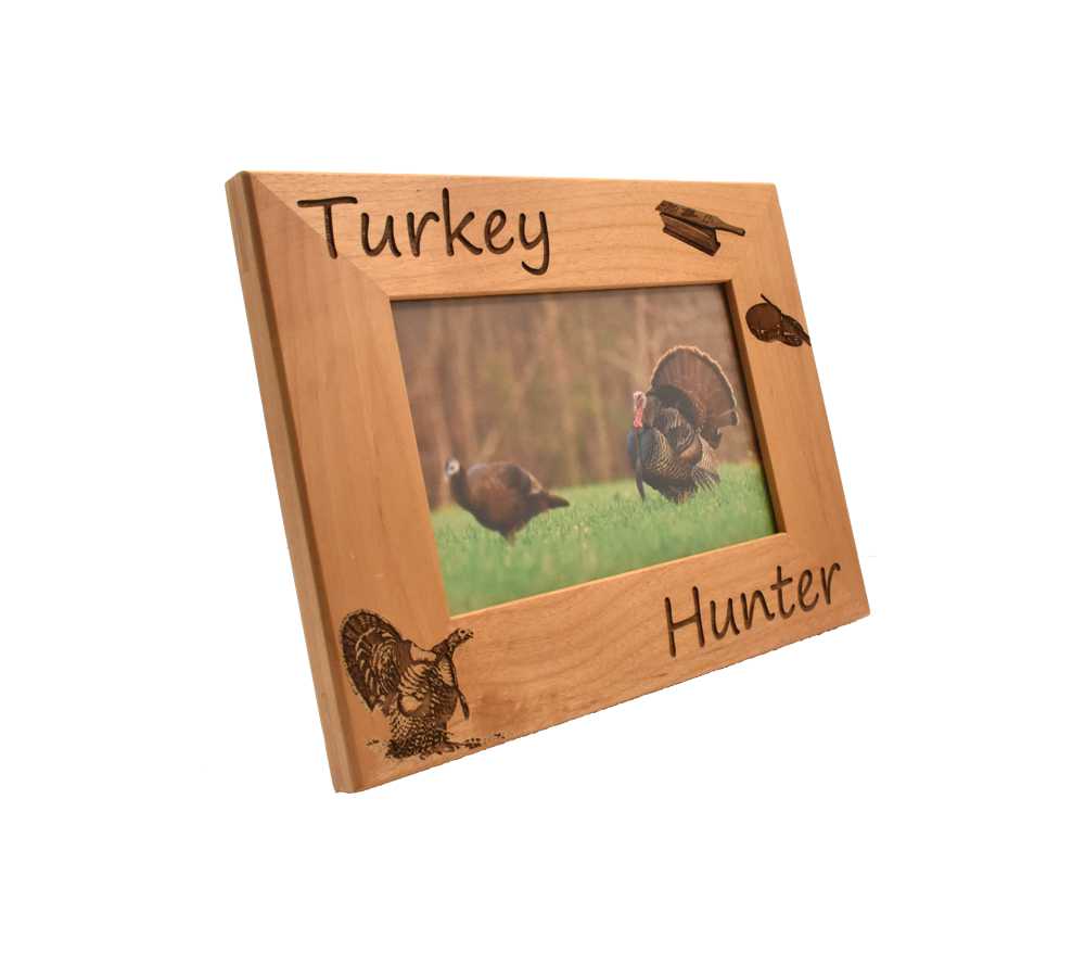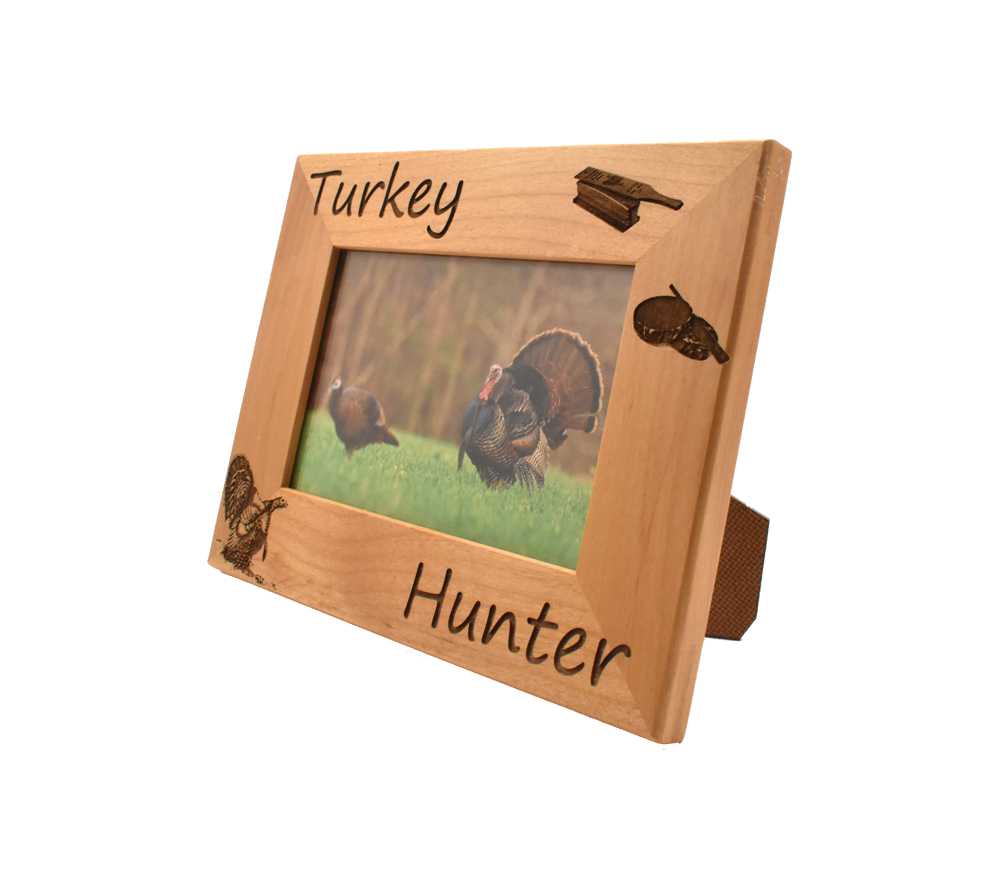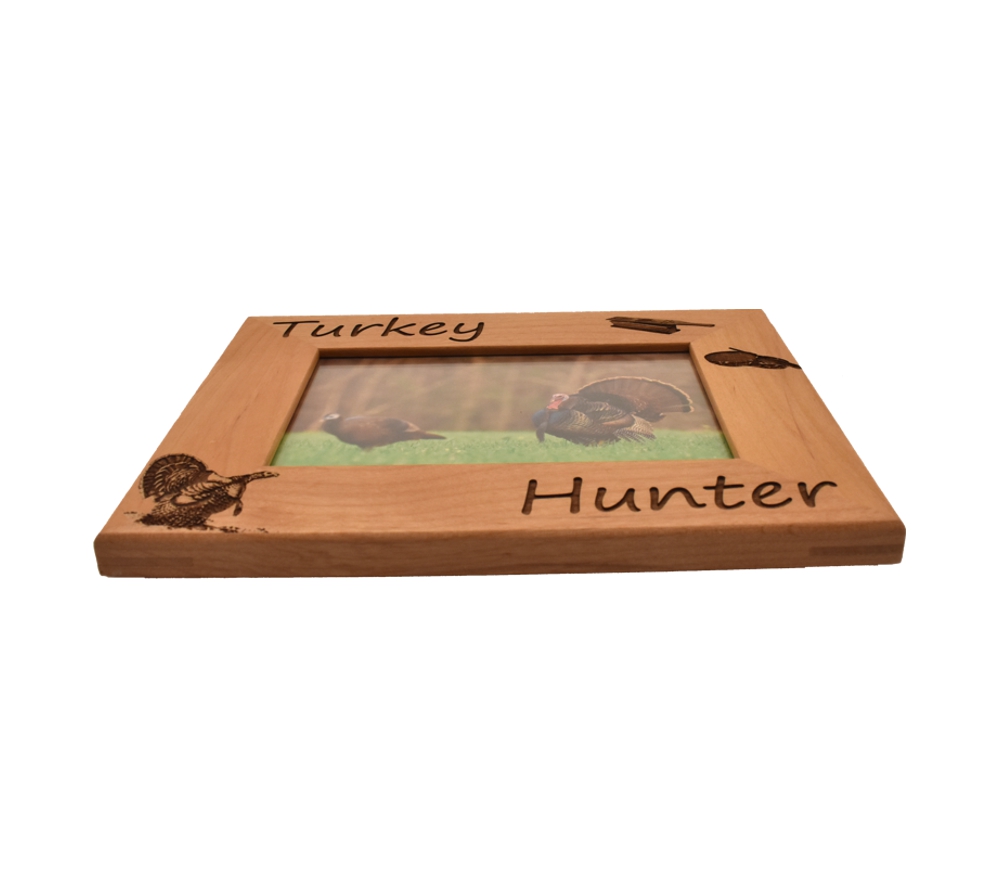 Highlight your most special turkey hunting memories with a personalized hunting picture frame from Whitetail Woodcrafters. This laser engraved wood frame is made from solid alder wood and will look great in your home, office, cabin, or display room. Our engraved wooden picture frames are available to hold a 4×6, 5×7, or 8×10 inch photo and can be hung on the wall or set on a flat surface using the attached stand.