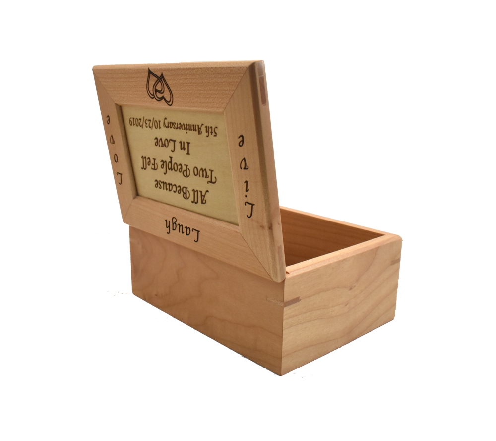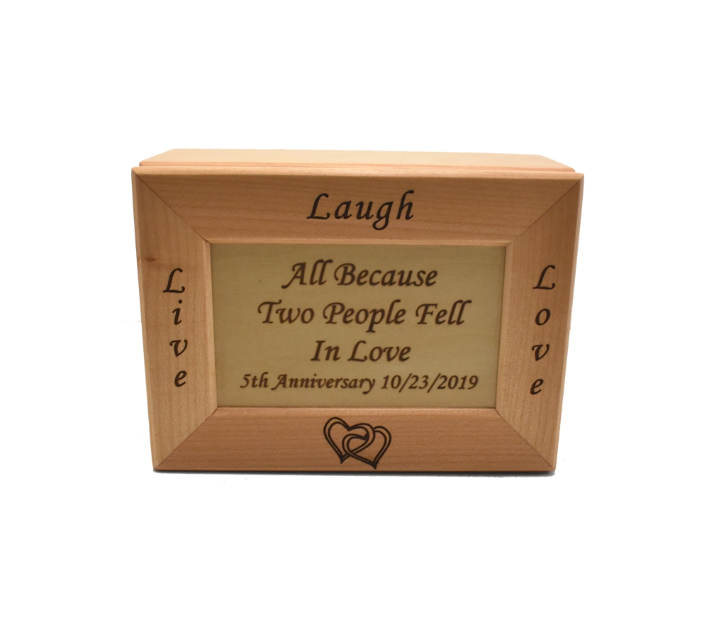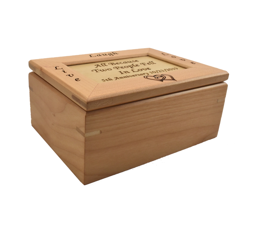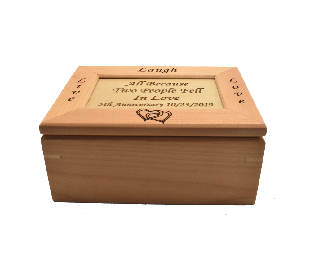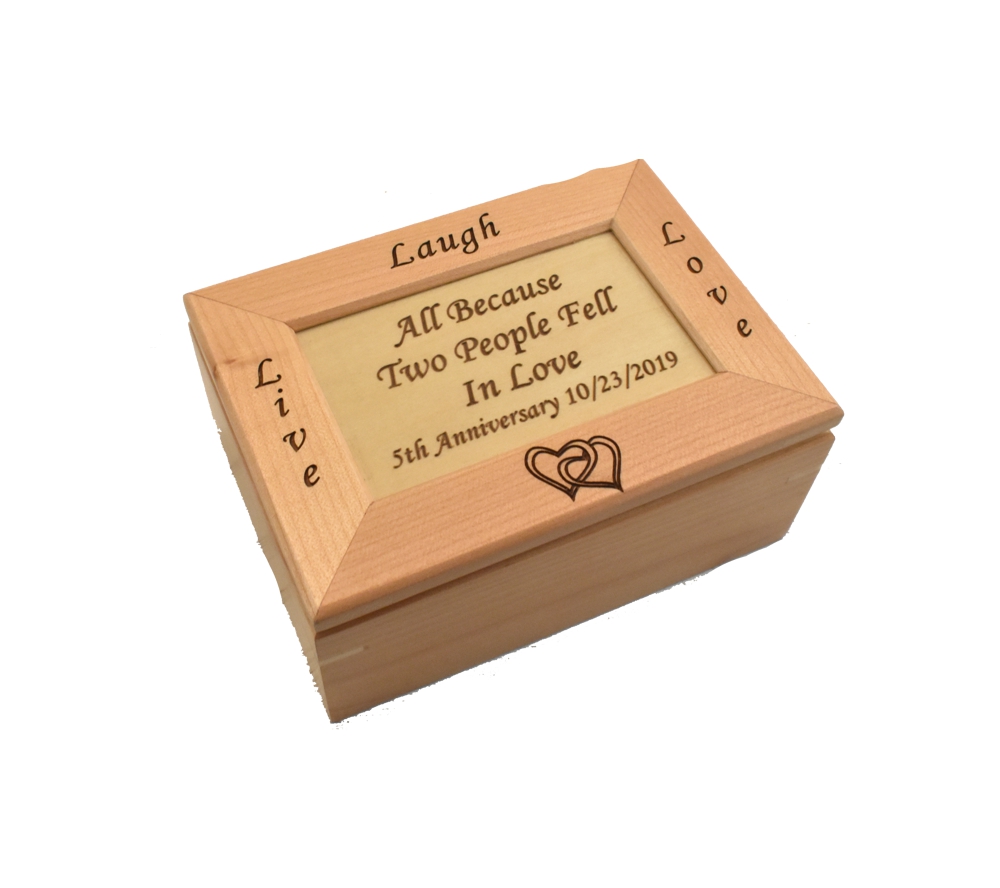 Create a beautiful keepsake box to celebrate your anniversary with a personalized wooden keepsake box from Whitetail Woodcrafters. Made from solid maple and custom engraved, this laser engraved wooden box features a hinged lid and a velvet lined bottom to provide safe storage of your valuables. Use your imagination to make this engraved memory box as special as the day it represents.