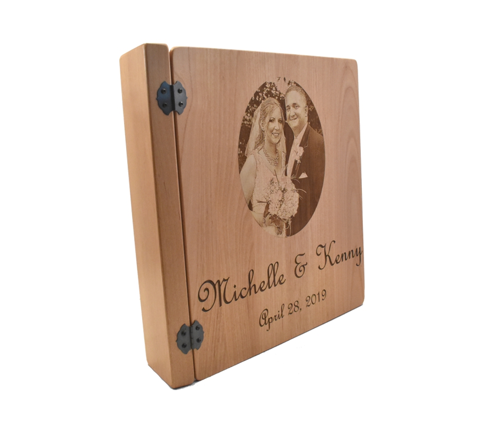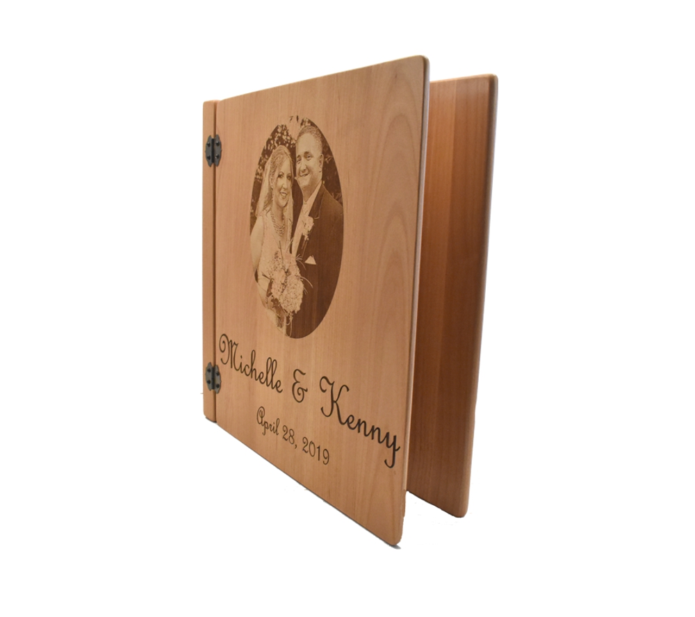 Feature your favorite wedding photos for everyone to see in a personalized photo album from Whitetail Woodcrafters. Handcrafted from solid alder, this wedding photo album allows you to have one of your favorite pictures engraved on the cover, and is perfect for displaying all of your beautiful wedding photos. All of our custom engraved wooden photo albums feature a standard 3 ring binder insert that can hold any 8.5″ x 11″ page. This allows you to make a completely custom album, scrapbook, guestbook, or a mixture of these pages for a one of a kind wedding display. We have a variety of sizes of page inserts available for purchase with your album as well.