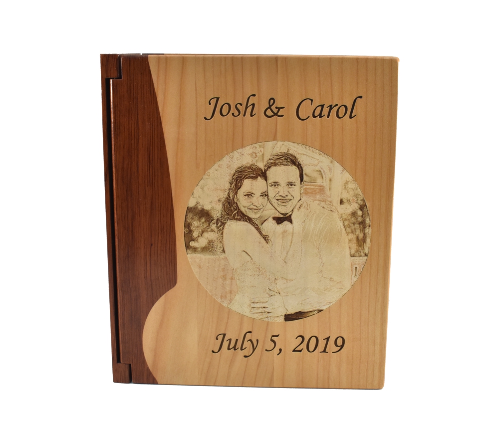 Feature your favorite wedding photos for everyone to see in a personalized photo album from Whitetail Woodcrafters. This engraved wooden photo album allows you to have one of your favorite pictures engraved on the cover, and is perfect for displaying all of your beautiful wedding photos. All of our large wedding photo albums are crafted from solid maple and rosewood for lasting beauty and durability, so you can create a beautiful personalized wedding or anniversary gift that will be treasured forever.