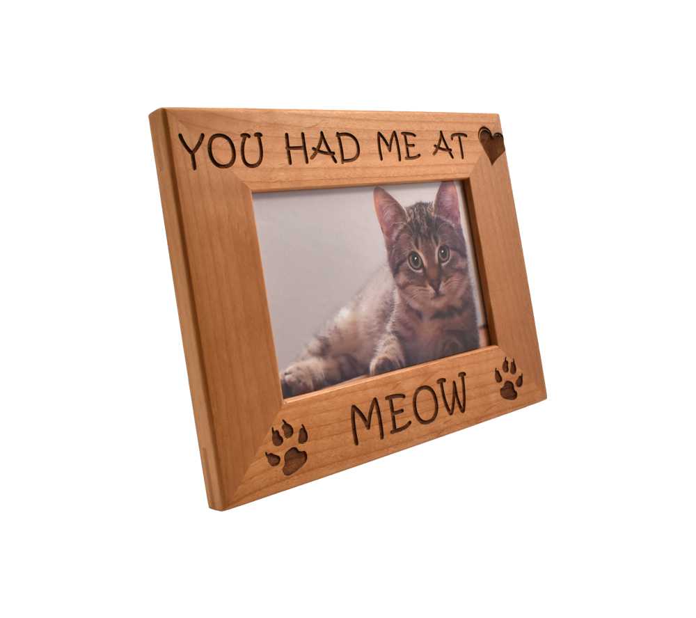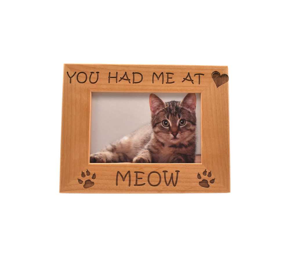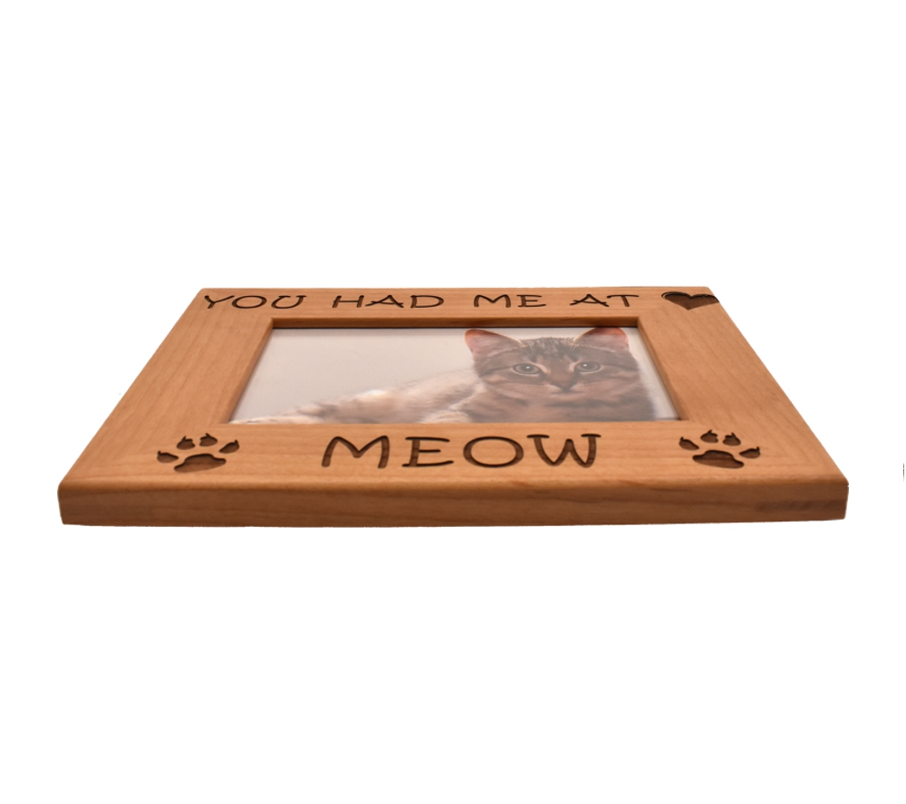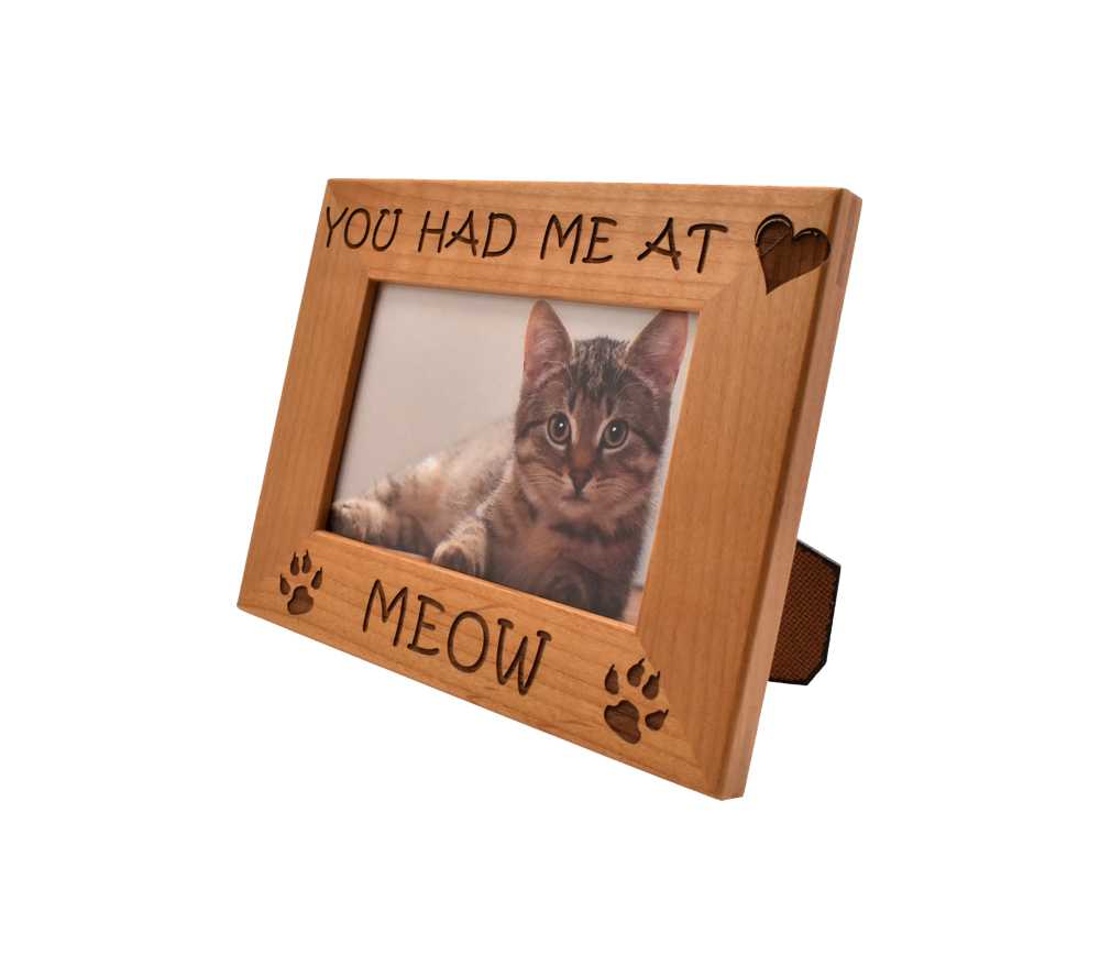 You can show off your favorite four legged friend with a personalized cat picture frame from Whitetail Woodcrafters. All of our laser engraved wood picture frames are made from solid alder wood and will be cherished by your family forever, even after your pet has passed on. This engraved wooden picture frame is available to hold a 4×6, 5×7, or 8×10 inch photo and can be hung on the wall or set on a flat surface using the attached stand.