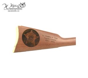 Here’s what Daniel had to say about his recent order, “Nothing but a great experience from Whitetail Woodcrafters. We worked with Katie on the design and were able to provide an engraving that shows their attention to detail and level of quality and care. We were able to leave the stock attached to the shotgun due to them having an FFL making the process even simpler. This was given to a police Lieutenant with 29 years of service and set the bar pretty high for retirement gifts.”