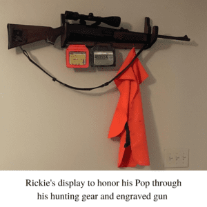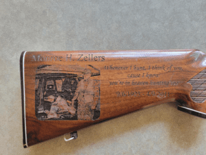 Don’t just take our word for it! Our customer Rickie is honoring his loved one. Here’s what he has to say about his custom gun stock engraving, “I remember a while back seeing your stand at the then Sportsman’s Show at the Farm Show Building.  I had planned on doing a picture on a stock then and just kept procrastinating.  Deer hunting is like life on my dad’s side of the family.  From 12 years old on, I hunted with my Grandfather, Uncle, and Dad.  We hunted together not only in Pennsylvania, but also Virginia, and New York.  I had 3 best friends in my life that would do anything in the world for me.  My grandfather had already passed away at the time, but at my 25th anniversary of hunting with my dad and uncle, I bought them each a hunting rifle.  When I gave my uncle his rifle he gave me Pop’s (my grandfather) 760 243, which was his pride and joy gun.  I cherish every item of Pop’s that I own.  I again saw your stand this year at the Great American Outdoor Show.  My dad said I should get a gun stock done on one of Pop’s guns that I own.  I signed up to receive email information from you all.  You had sent out an email stating the deadline for the show special pricing. I decided that it was time to do the project I wanted to do for a long time.  I then contacted you via email and the process began. Finding the picture I wanted to use was the toughest part.  Pop didn’t like looking at the camera when his picture was taken lol.  I spoke to my dad to decide which gun to use.  We decided on his 760 243.  You all went out of your way to keep in contact with me the entire time and help to put together the masterpiece I now have.  I get choked up knowing he is looking down on me, and I just hope he loves this beautiful piece as much as I do!  Thank you all so very much for everything you have done!”